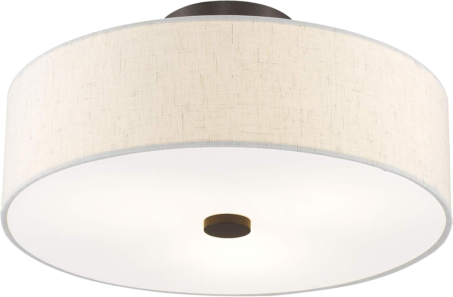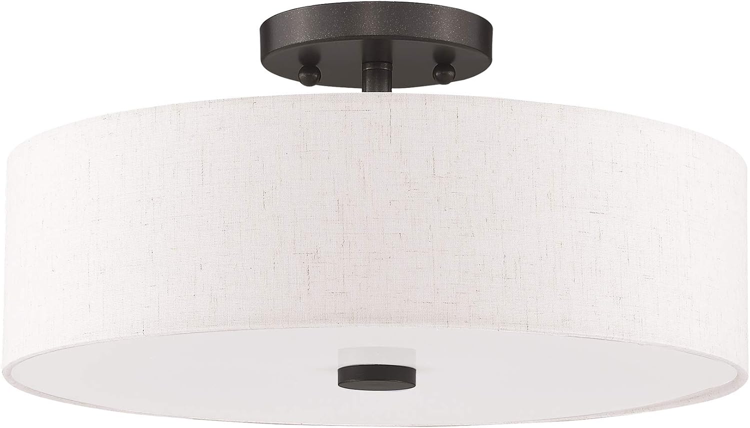 Livex Lighting 52135-92 Meridian Collection 3-Light Semi Flush Mount Ceiling Fixture with Oatmeal Color Fabric Hardback Drum Shade and Satin White Diffuser, English Bronze
