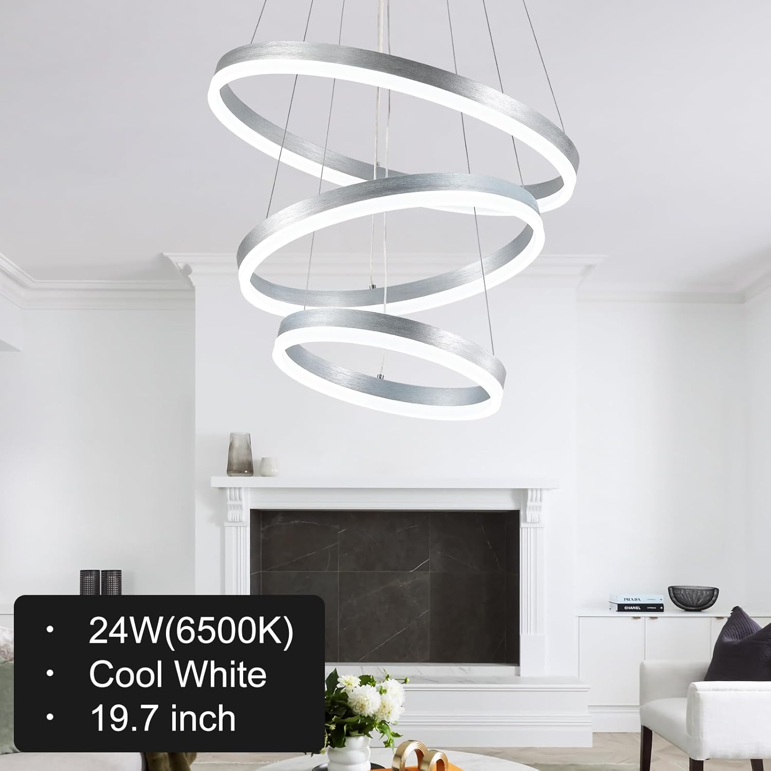 - 【Dimmable & Color-Tunable LED Lighting】This 45W silver 3-ring pendant light is equipped with a high-clear LED strip that delivers 3000K-6500K cool white light—adjust the color temperature to match your mood, from warm 3000K for quiet evenings to bright 6500K for meal prep. It also supports 10%-100% brightness adjustment with any US standard dimmer switch (not included), letting you tweak light intensity for dinners, movie nights, or daily activities