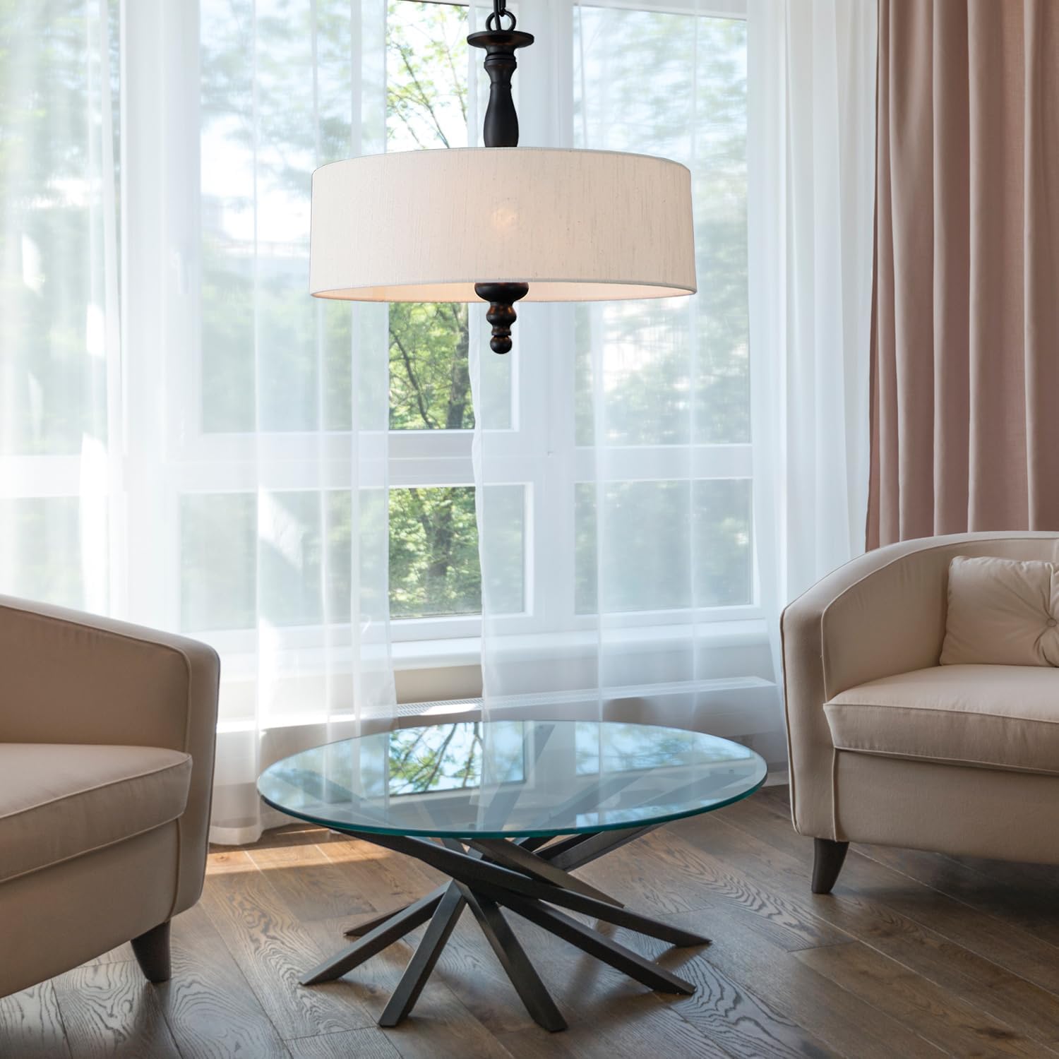 - 【Perfect Size】The chandelier's beige linen lampshade measures 17.3" in diameter and 6.3" in height, providing a balanced and eye-catching focal point. This chandelier 19" in overall height, and the hanging chain can be adjustable, max 59", making it ideal for all size rooms.