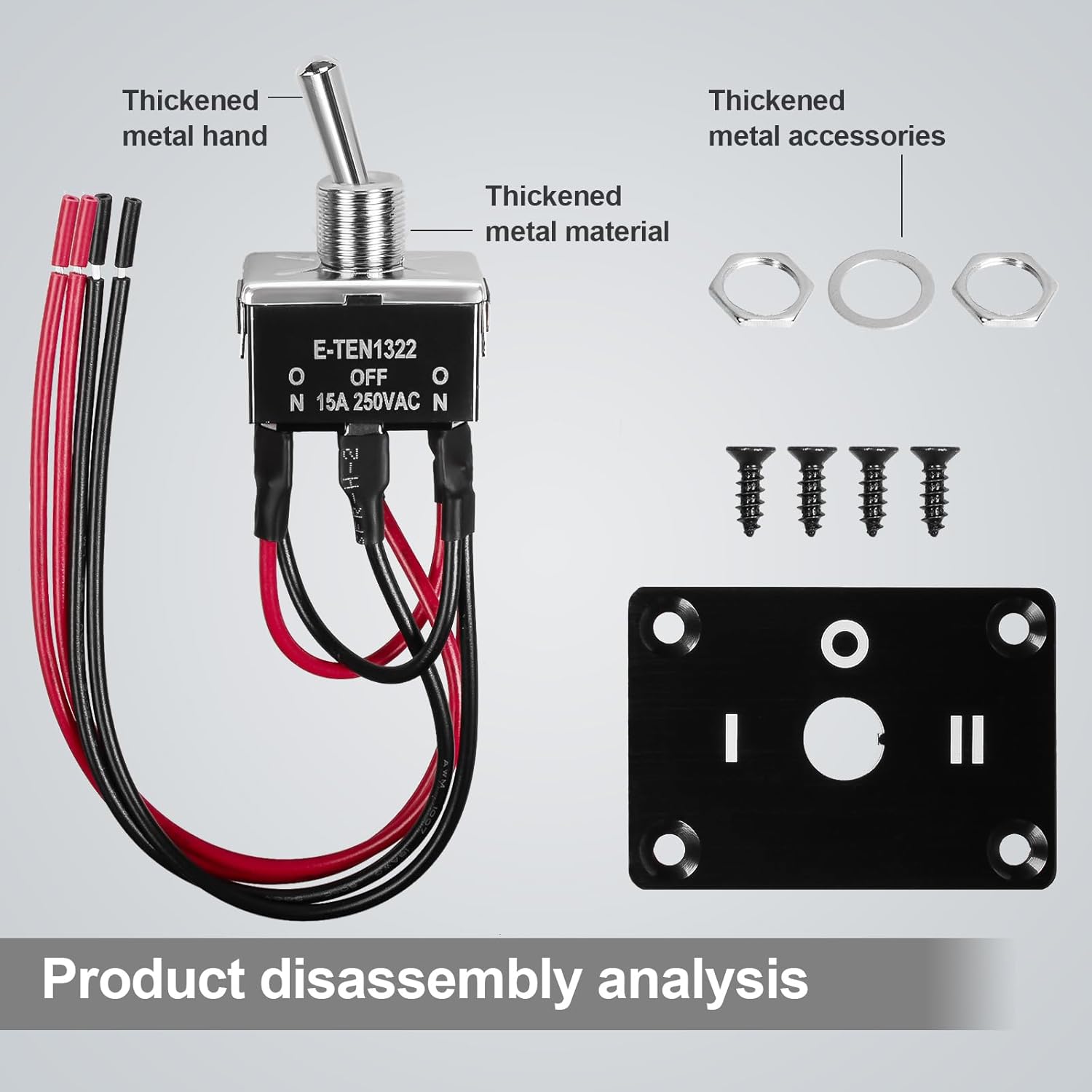 - Product parameters: Current and Voltage:15A-250V AC/DC Terminal:6-pin Waterproof baffle size:63.5mm *44.7mm *2.5mm (length*width*thickness) Package includes:1pcs toggle switch,1pcs waterproof cap ,1pcs waterproof baffle