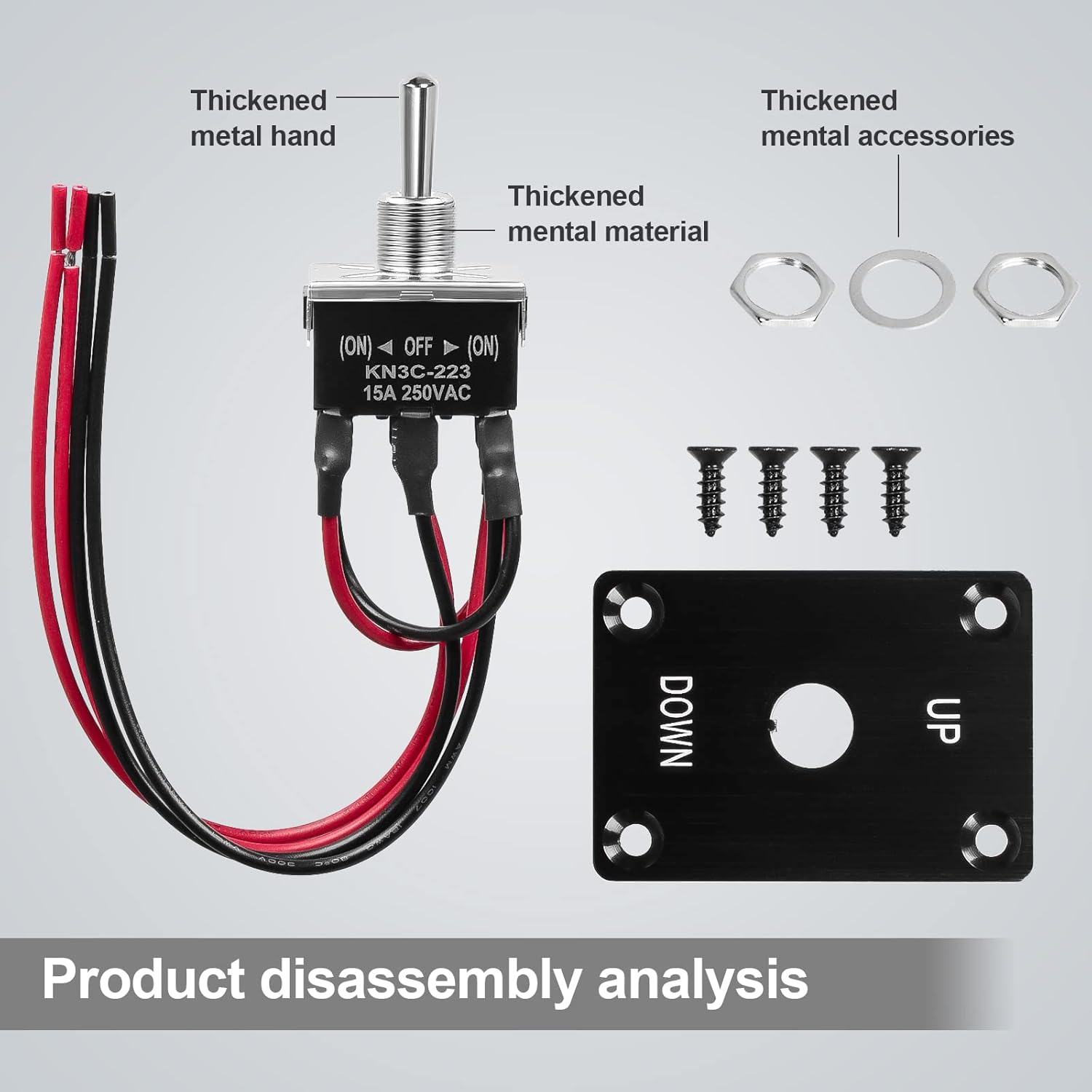 - Product parameters: Current and Voltage:15A-250V AC/DC Terminal:6-pin Waterproof baffle size:63.5mm *44.7mm *2.5mm (length*width*thickness) Package includes:1pcs toggle switch,1pcs waterproof cap ,1pcs waterproof baffle