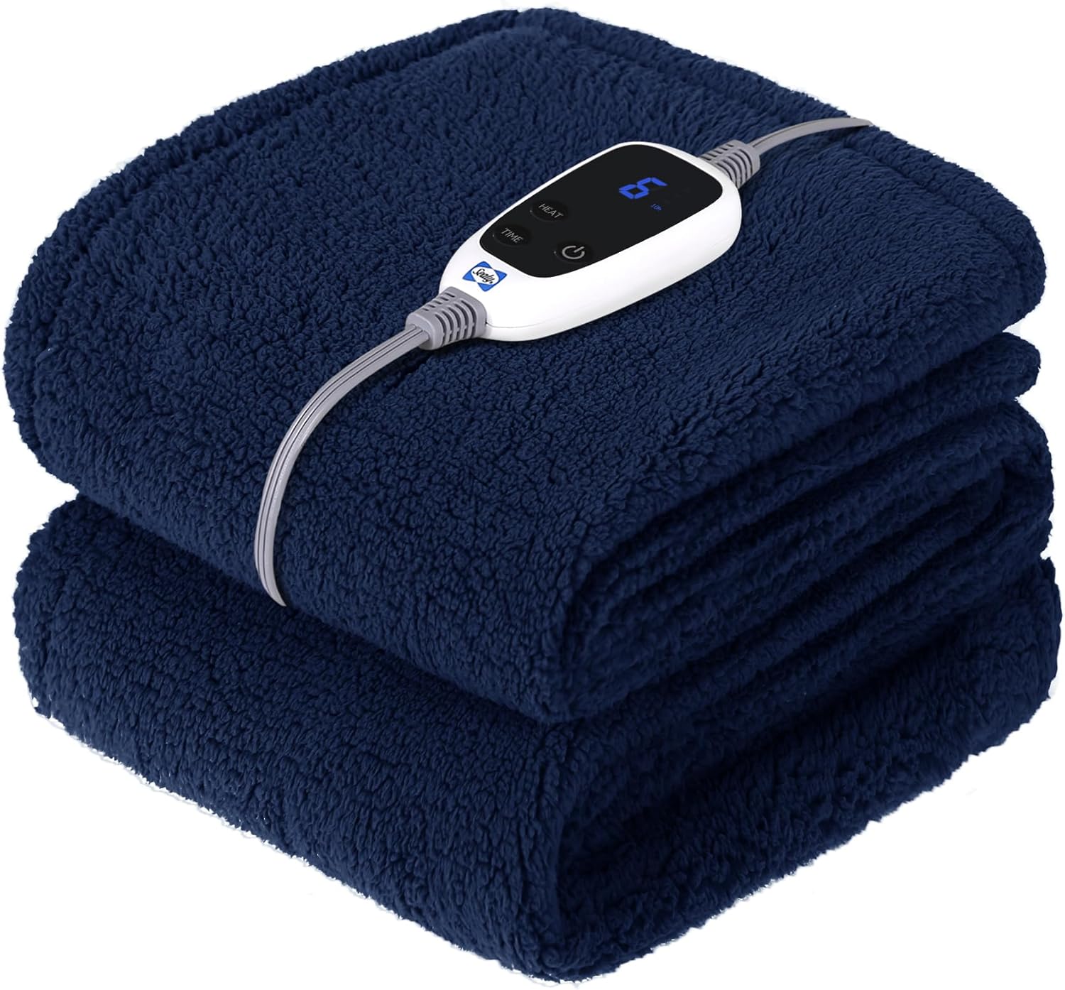Sealy Electric Blanket Heated Throw 50"x60" Soft Double Sherpa Super Cozy with 6 Fast Heating Levels & 2-10 Hours Auto-Off, Over-Heat Protection, Machine Washable, Navy Blue