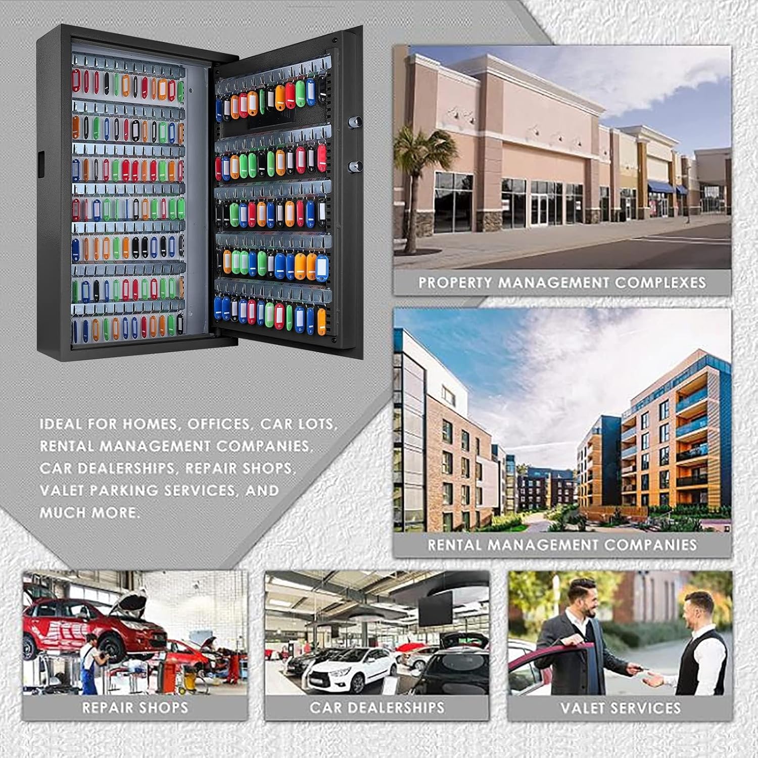 - 【MANAGE KEYS EFFICIENT】Our 160 position key lock box has numbered key slots and colorful key tags for keeping your keys well organized. The key hooks are large enough for picking up keys or putting multiple keys on one ring. The key hook plates are adjustable, so you can adjust the space between rows as needed.