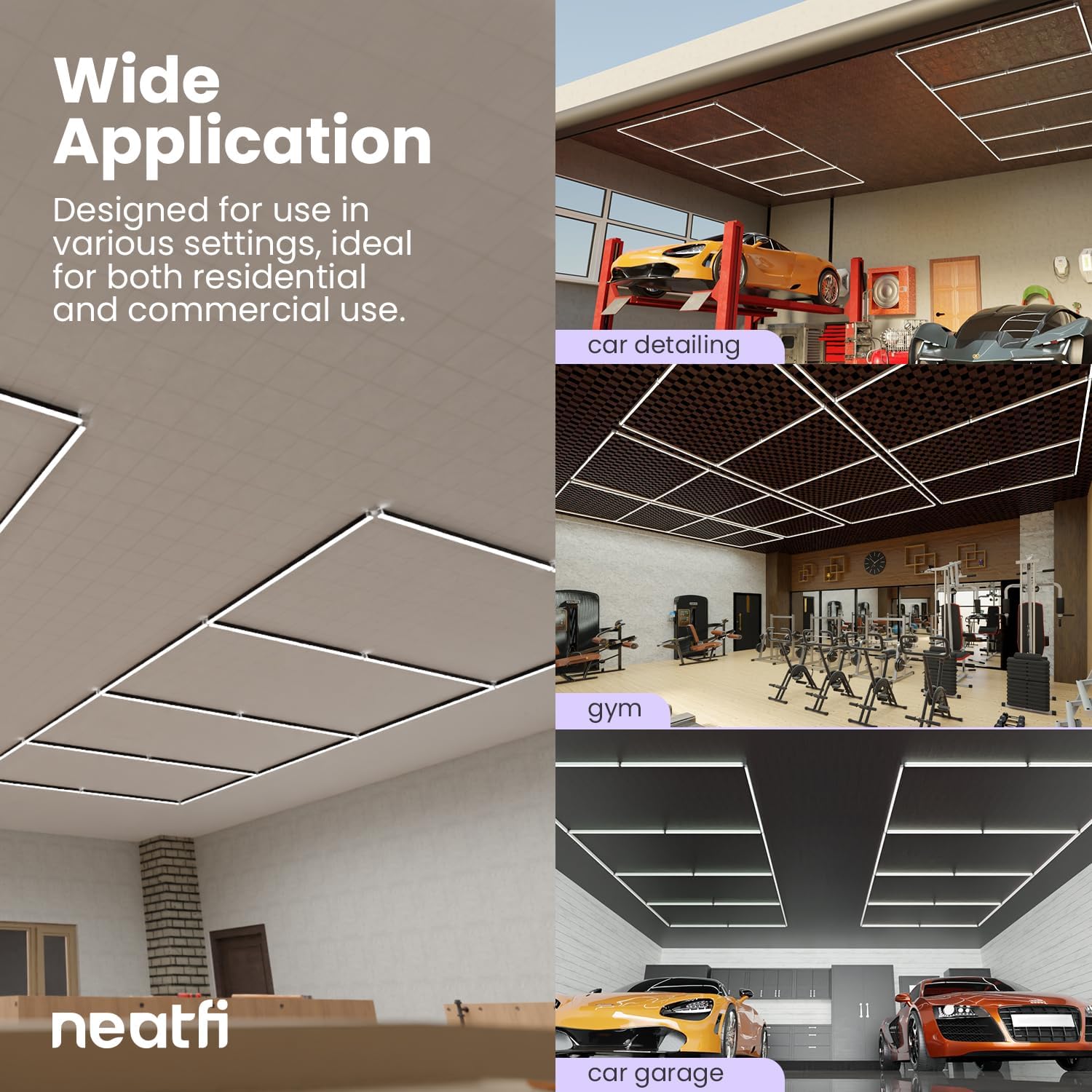 - Ultra-Bright 4-Panel LED Garage Light – Neatfi’s LED garage light provides wide, even illumination with four adjustable panels, delivering 31,680 lumens at 6500K for clear visibility. Perfect for garages, workshops, detailing areas, and more.