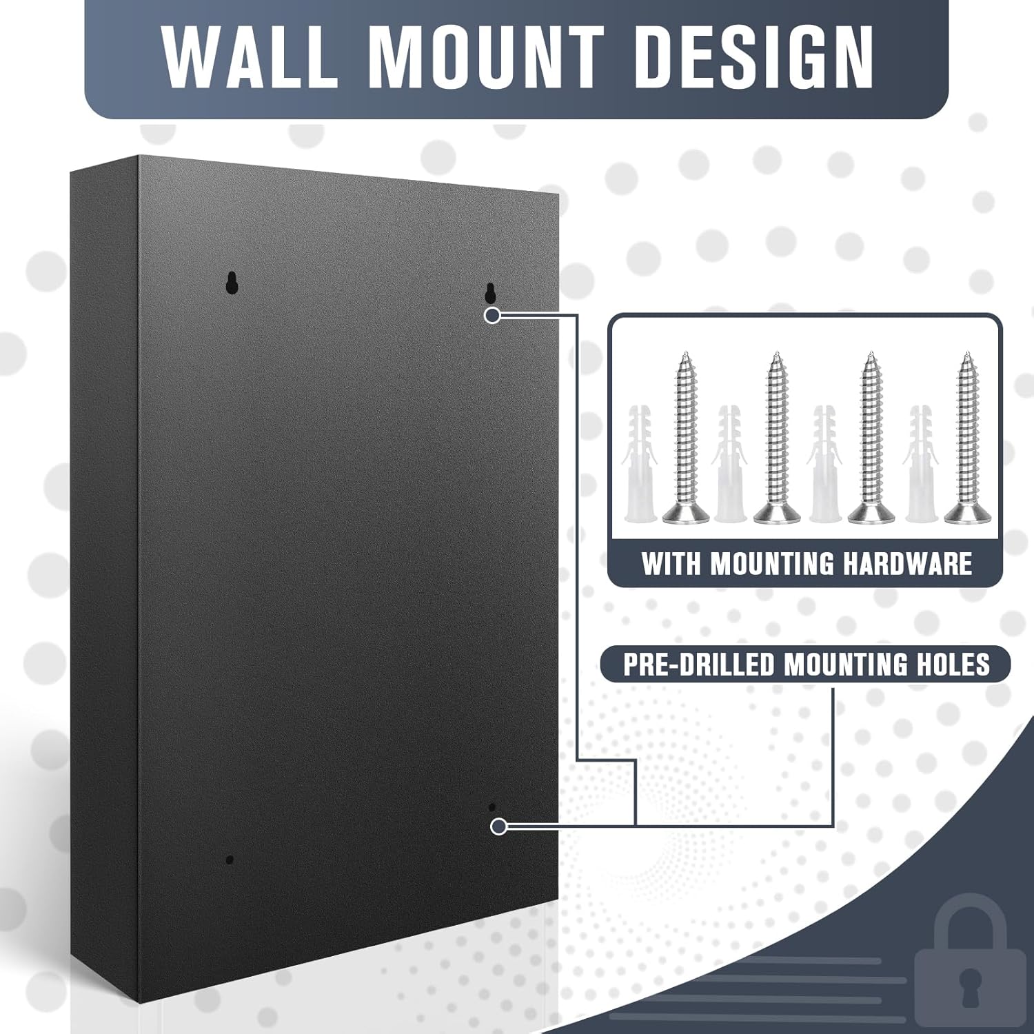 - Wall Mount Lockbox: This wall-mounted key lock box features pre-drilled mounting holes and includes mounting hardware for effortless installation. Additionally, the package comes with 64 colored key tags and 2 keys. The box dimensions are 11.81" x 3.15" x 17.72"
