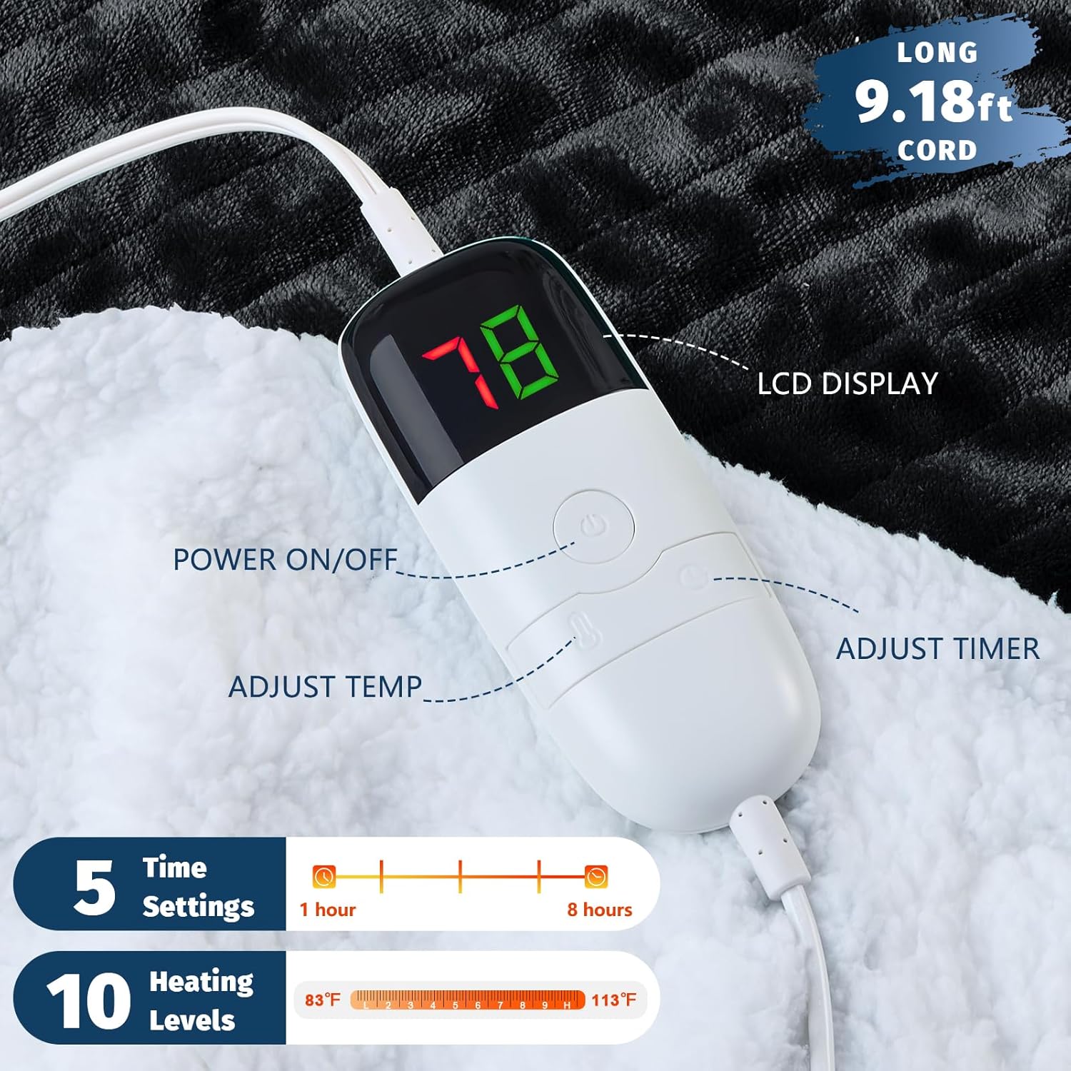 - 【10 HEATING LEVELS】: Find your perfect warmth about heated throw blanket with 10 different heating levels( 83℉-113℉) using LED controllers,which can intuitively display the temperature and customize the time(1/2/4/6/8 ).Wrap yourself in electric throw blankets for adults and enjoy all-night warmth if you're struggling to sleep in cold weather because you're curled up in bed with cold hands and feet.