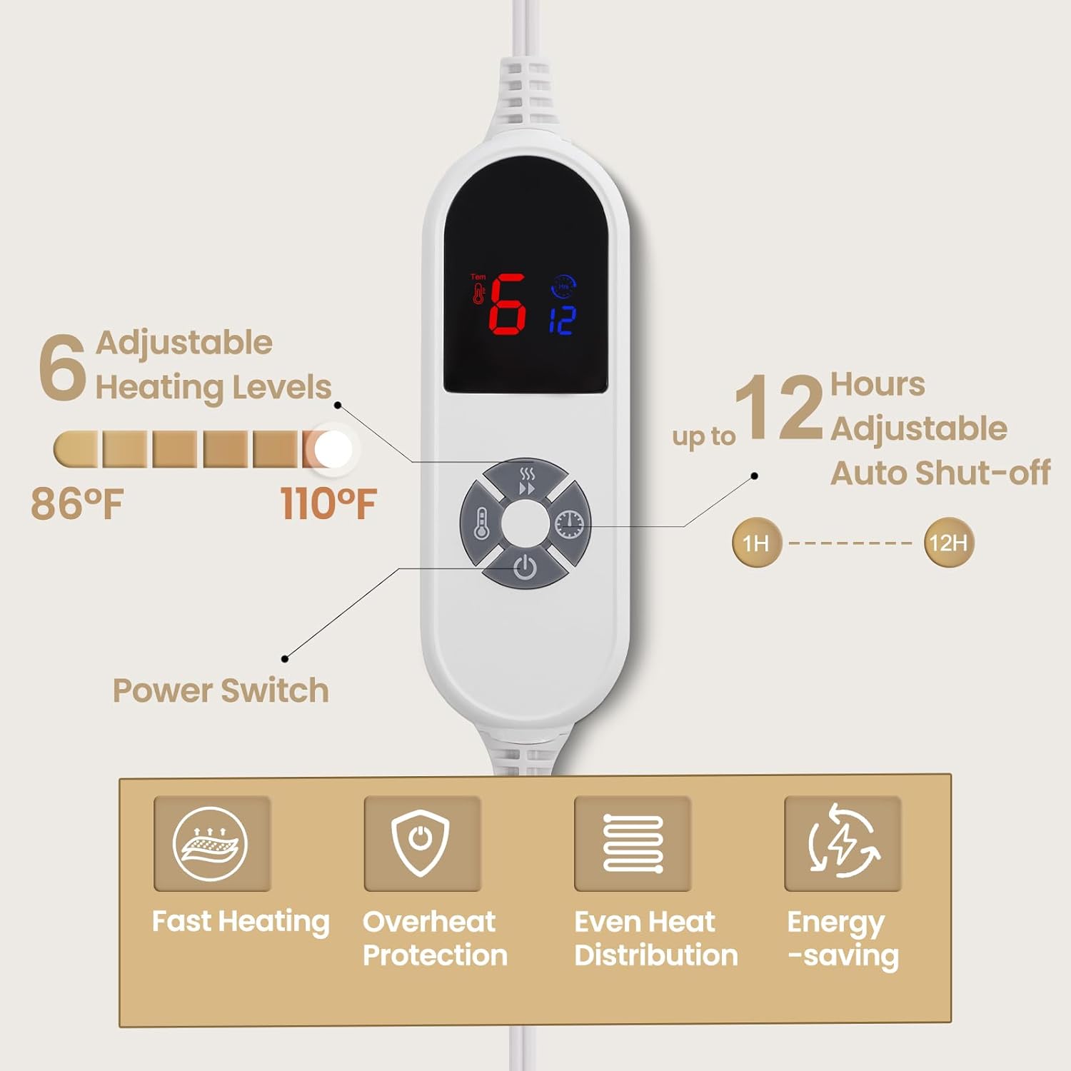 - 6 Customizable Heating Levels: Tailor your warmth to perfection with 6 customizable heating levels. Whether you crave gentle warmth or crave a toastier sensation, this blanket caters to your every desire, making your experience truly bespoke.