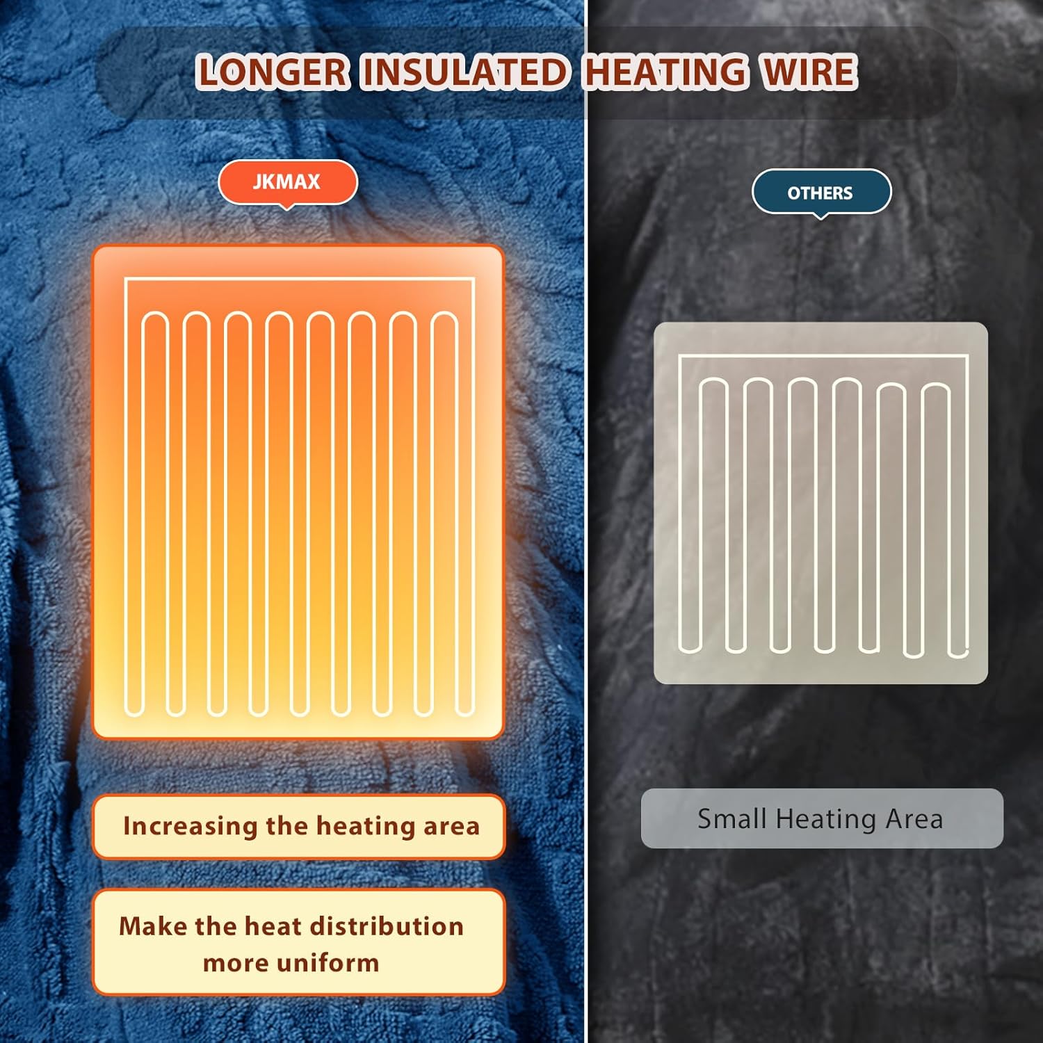 - SAFE CHOICE: JKMAX Heated blanket has passed UL 964 safety standard testing and obtained ETL certification, ensuring quality.The heating wire designed by a Japanese company through advanced technology has excellent insulation and stronger flame retardancy.The built-in NTC overheat protection system actively monitors temperature to prevent overheating risks and ensure absolute safety during operation