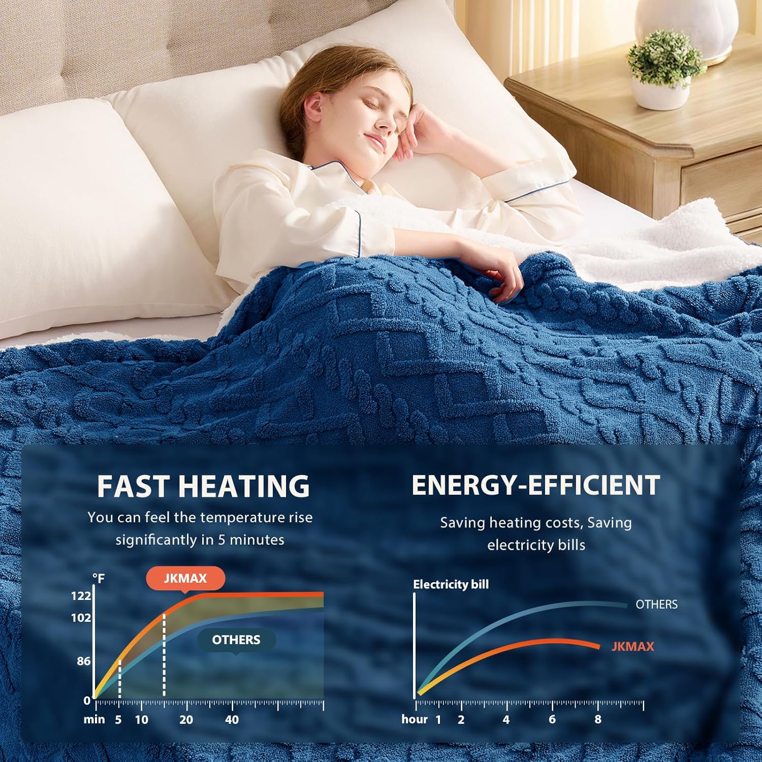 - SOFT & COMFORTABLE FABRIC: JKMAX Electric blanket is made of 220gsm Sherpa with a particularly soft touch.The heating wire diameter of the electric blanket is 2.2 millimeters,which is almost imperceptible when lying on it