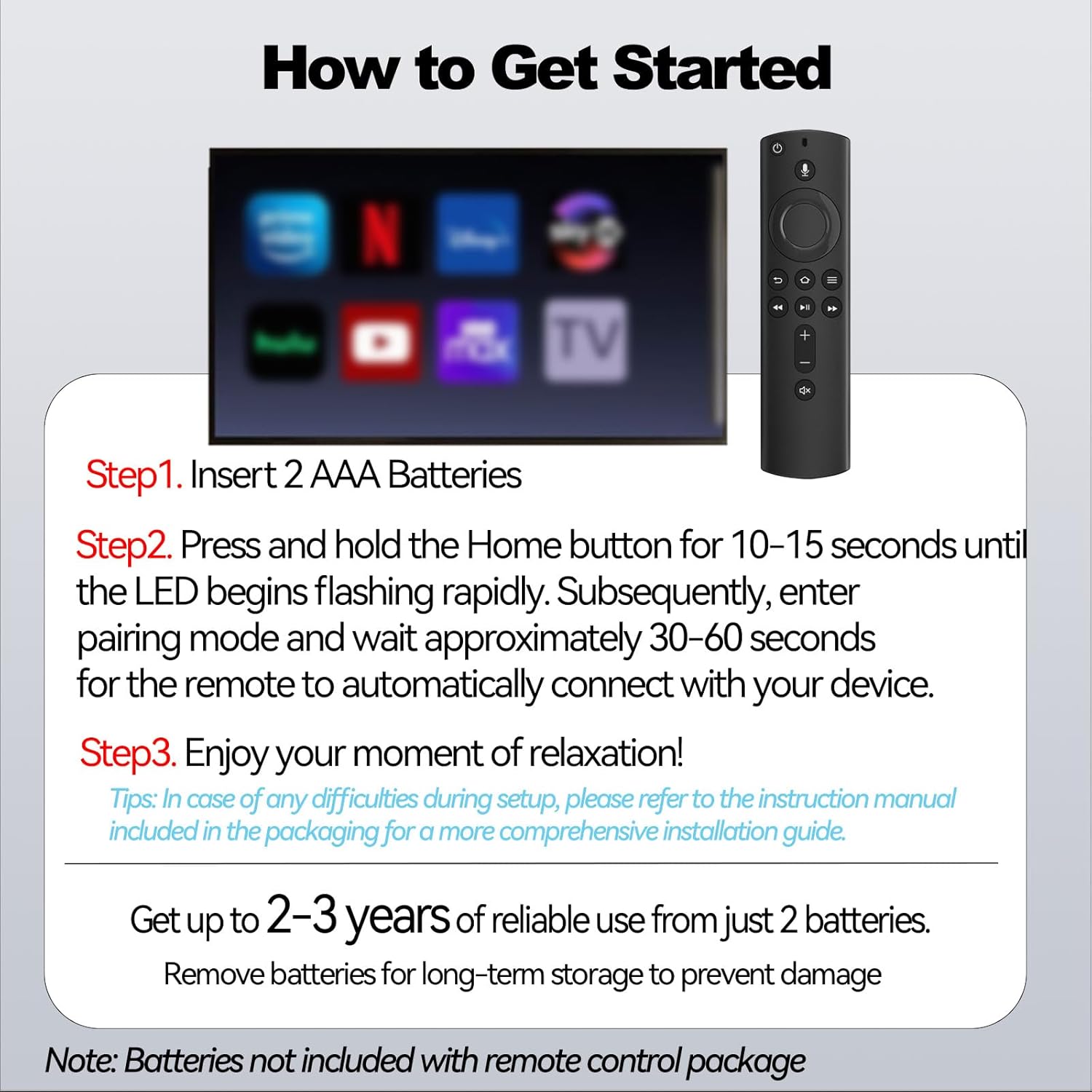 - Attention: You need manually pair your voice remote control, before pairing, ensure the batteries from the old remote control are removed to cancel any previous pairing; For ongoing updates, simply press the voice or return button; If the voice remote becomes unusable, utilize the original remote to manually add or replace it; Verify that your remote is not connected to more than 6 devices to avoid any limitations.