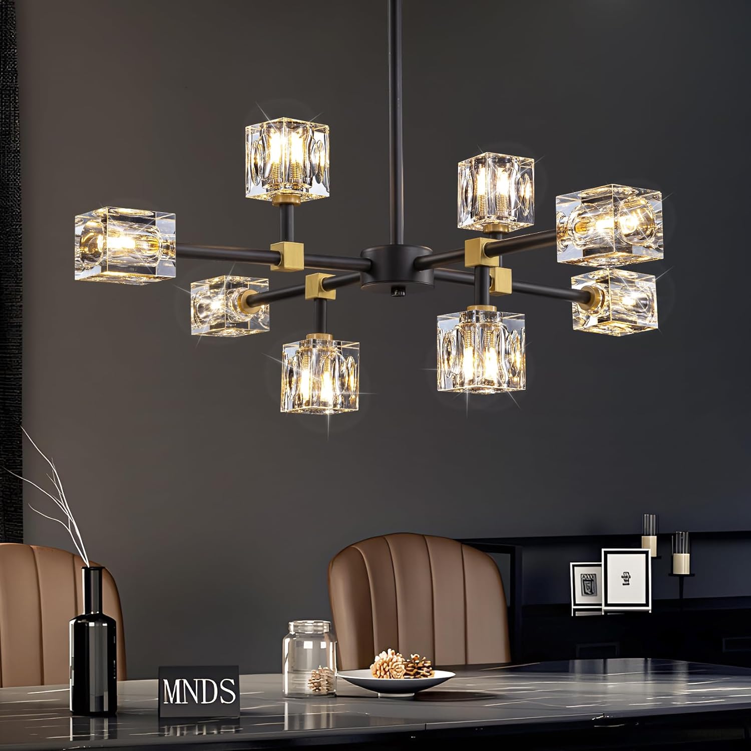 - 【K9 Crsytal Chandeliers】The 8 lampshades of the chandeliers are made of clear K9 crystal, the lamp body is made of high-quality polished brass, the cube crystal lampshade is matched with G9 bulbs (bulbs are not included), and the crystal chandeliers reflects the bright light effect and projects it to the ceiling, making your home Reveals a low-key and elegant atmosphere