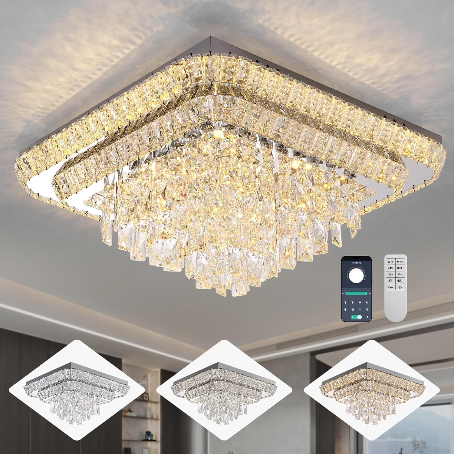 - 【DIMENSION】The overall size of the crystal flush mount lights is 24" x 24" x 12"H, and the canopy is 24" x 24" x 1.57"H, lamp height: 12"; 3 Layers Led light source crystal light, Wattage: 33 W*5.