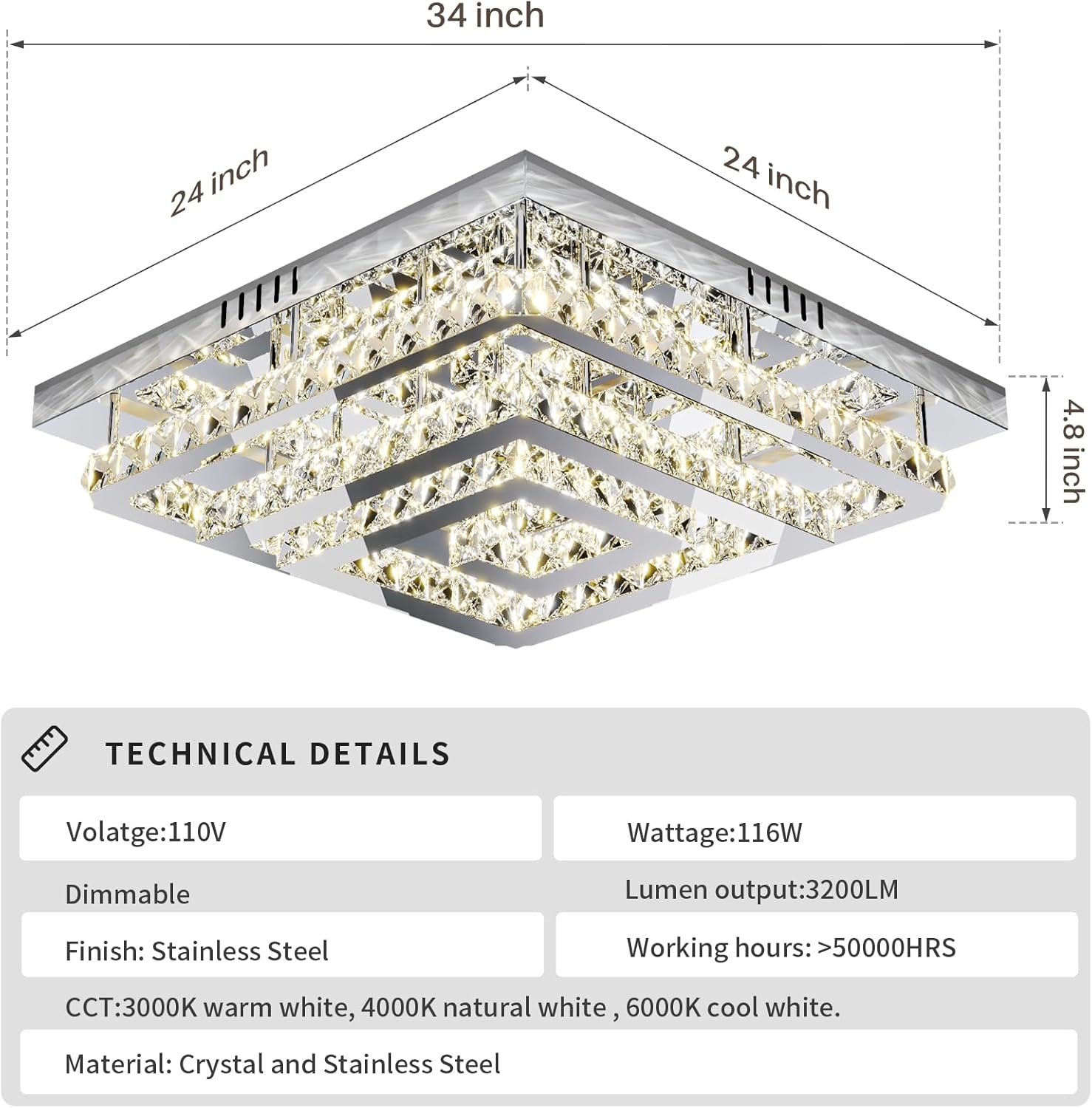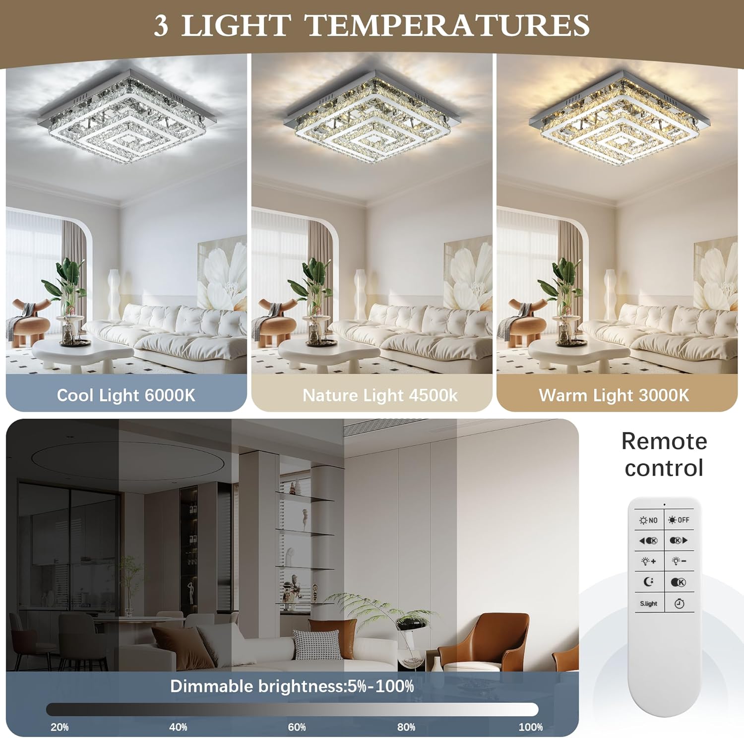 - Dimmable and 3-Color Temperature : Enjoy the flexibility of 3 color temperature settings with this Square Crystal Chandelier, making it easy to switch between warm, neutral, and cool light to suit your mood or activity. This Flush Mount Chandelier is equipped with dimmable LED technology, allowing you to customize the brightness according to your needs
