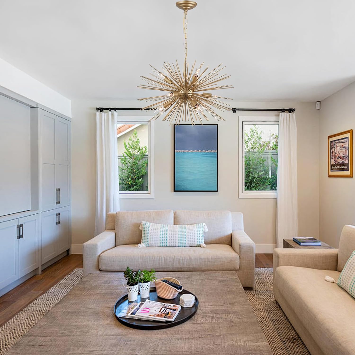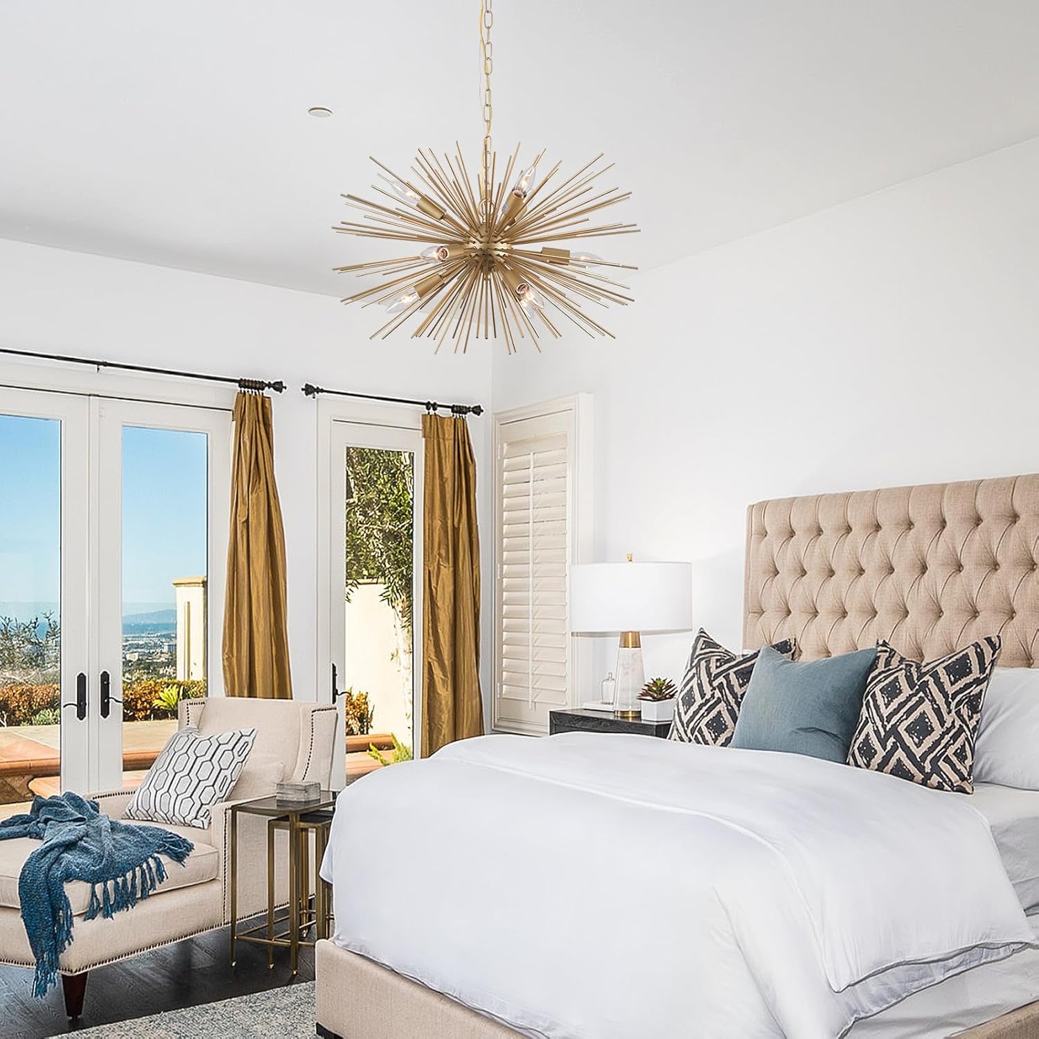 - 【Adjustable Pendant Chain】- Cawabien modern Starburst bedroom chandelier,24in(W) x 16.45in(H). The pendant chain is 59in long adjustable, you could choose the length you need before installing. Sloped and flat ceiling available.