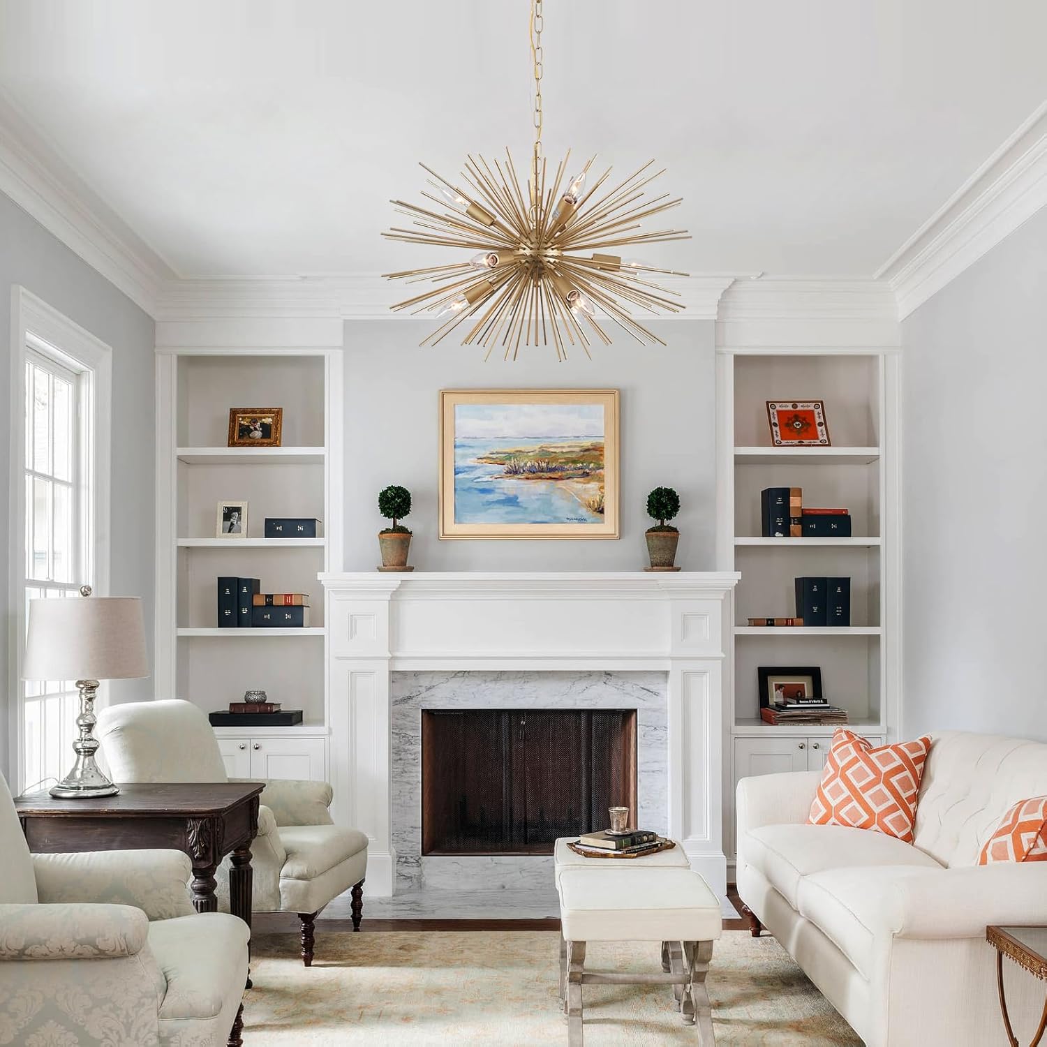 - 【9-light Sputnik Chandelier】- Cawabien Gold Starburst chandelier combines modern minimalist concept and special satellite design, bringing mid-century modern stylish vibe to your home. This Gold sputnik light fixture with 9-socket base, brings bright lighting for kitchen island, dining table, living room, study room, restaurant, hotel, bedroom, home office.
