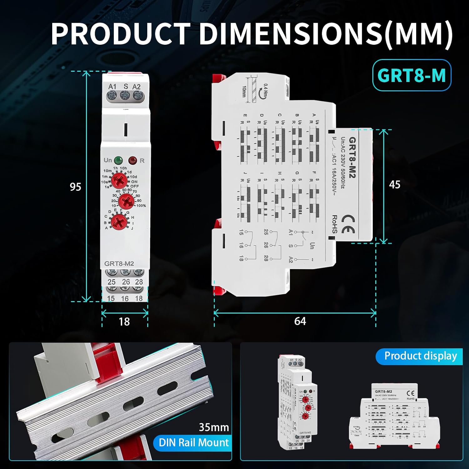 - Designed time relay: The GRT8 series delay relay has a sealed housing made of industrial grade ABS plastic to protect internal components. Its sturdy design can accompany your expensive equipment for a longer period of time and complies with UL standards CE、CB、RoHS。 The Din rail delay timer relay measures 2.88 inches x 3.68 inches x 0.9 inches, weighs approximately 3.33 ounces, and is installed on a 35mm Din rail. Durable, easy to install, portable and compact