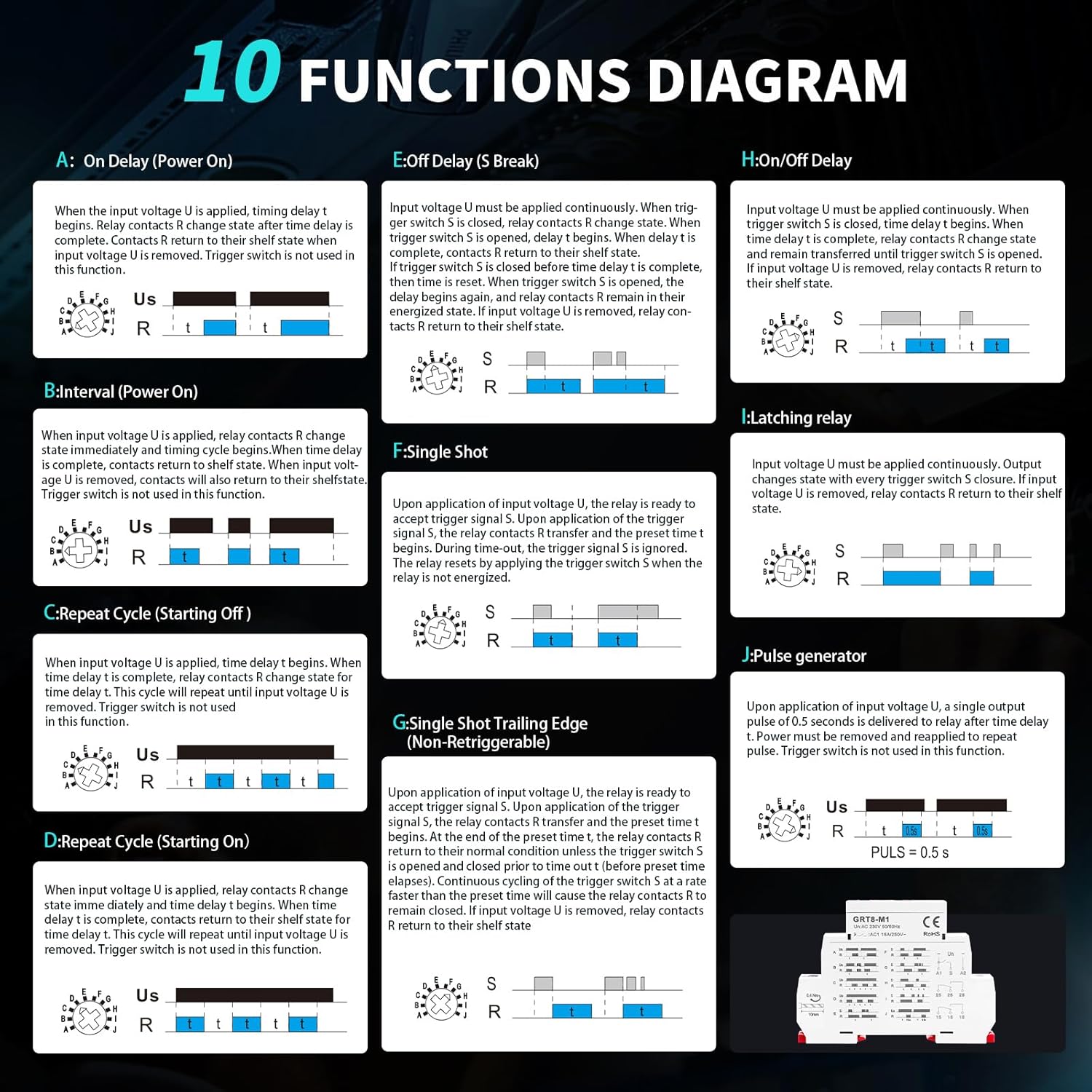 - Model of GRT8 Time Relay: 1. GRT8-A: Delay ON time relay; GRT8-B: Delay Off time relay; GRT8-S:Asymmetric Cycle Timer Relay (OFF-ON-OFF and ON-OFF-ON, the duration of OFF and ON can be set); GRT8-M: Multi functional time relay, covering GRT8 series A (delayed power on), B (delayed disconnection), C (cyclic delay: OFF-ON-OFF), D (cyclic delay: ON-OFF-ON),and function E as shown in the figure, F,G,H,I,J
