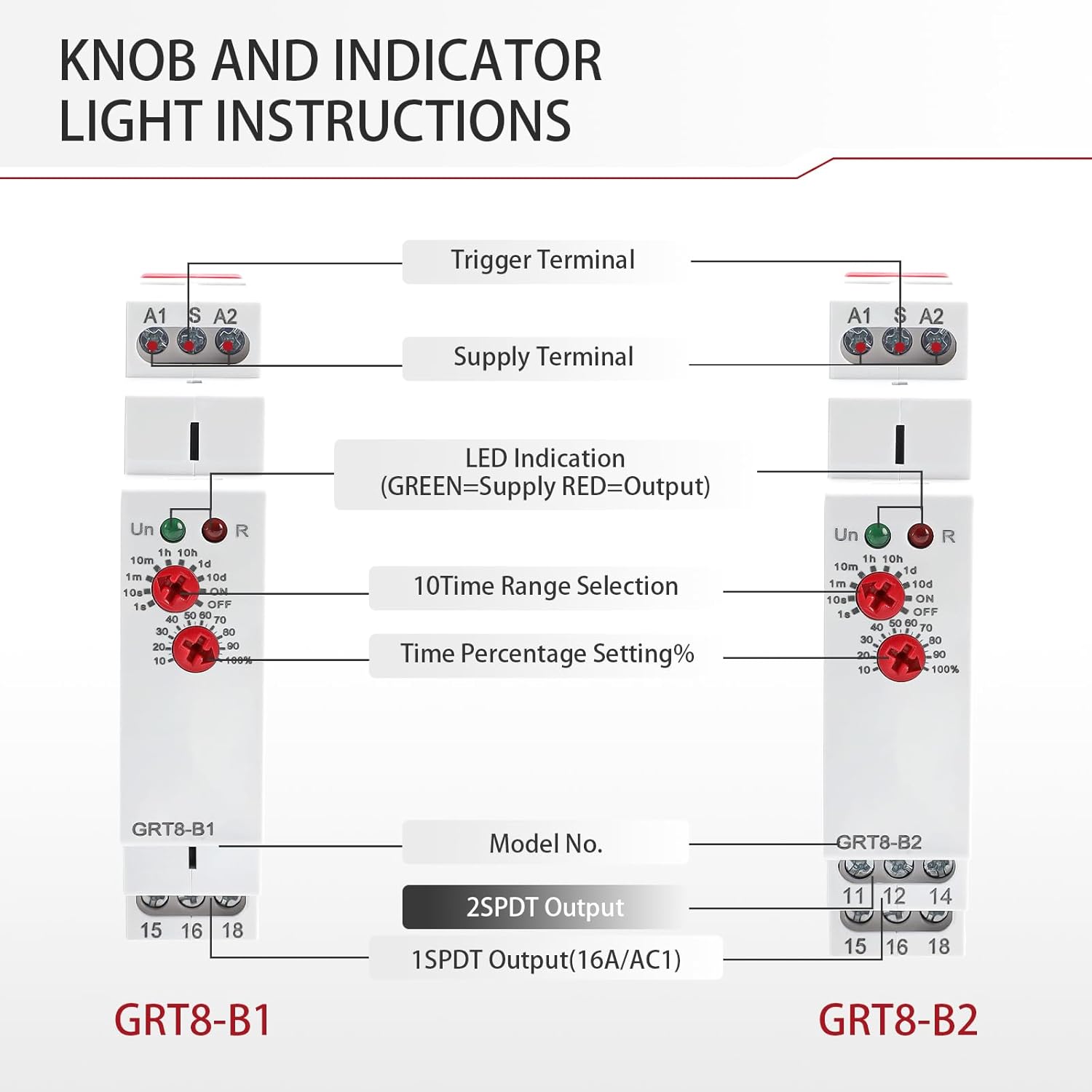 - Designed time relay: The GRT8 series delay relay has a sealed housing made of industrial grade ABS plastic to protect internal components. Its sturdy design can accompany your expensive equipment for a longer period of time and complies with UL standards CE、CB、RoHS。 The Din rail delay timer relay measures 2.88 inches x 3.68 inches x 0.9 inches, weighs approximately 3.3 ounces, and is installed on a 35mm Din rail. Durable, easy to install, portable and compact