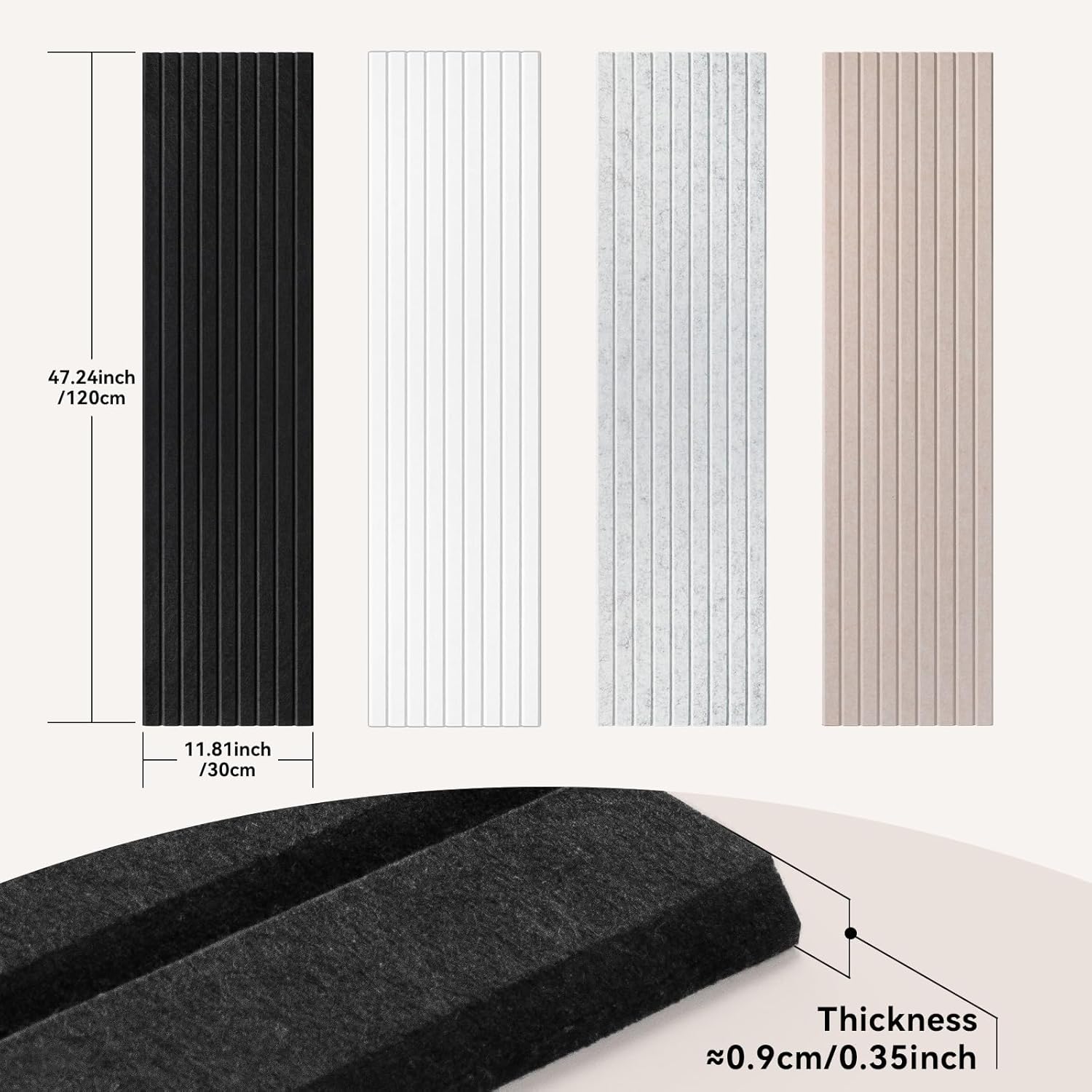- [High-Density Material] Made of polyester fiber, it has good stability and anti-aging properties, is not easy to deform, fade, or mold, and has excellent sound insulation compared to foam boards. Each measuring 47.24x11.81x0.35 inches. The larger panel design helps to disperse more noise and eliminate echoes more effectively than smaller panels.