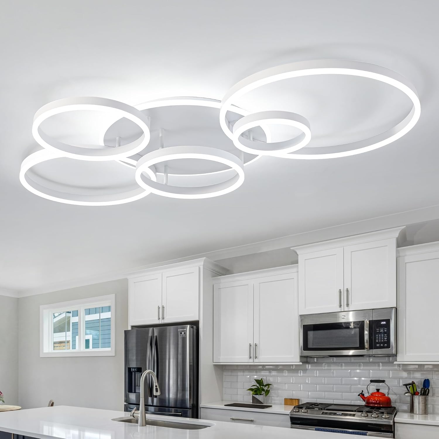 - POWERFUL LIGHTING EFFECT: This kitchen lighting fixtures ceiling is equipped with 6 rings lighting fixtures, the chassis also comes with LED beads, each ring is fitted with a high-brightness LED bead, providing powerful lighting effect.120 watts, 9,600 lumens, 110 volts. Whether in the living room, bedroom or dining room, it provides sufficient and even light, creating a comfortable and bright living environment for you.