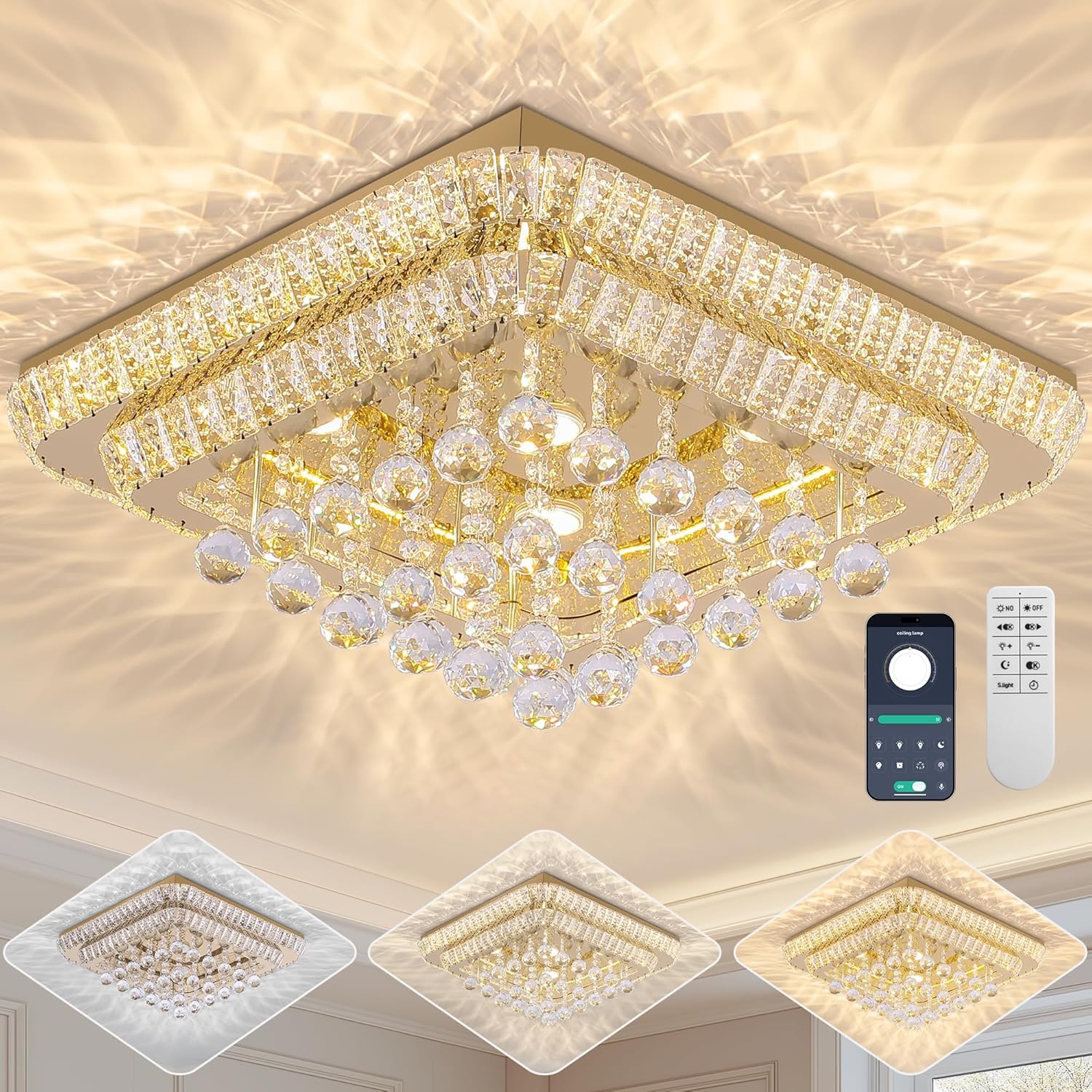 24 inch Crystal Flush Mount Gold Chandelier Remote/APP, Modern Raindrop LED Ceiling Light, 3CCT Dimmable & Brightness Adjustable,Elegant Chandeliers for Bedroom Hallway Dinning Room Living Room