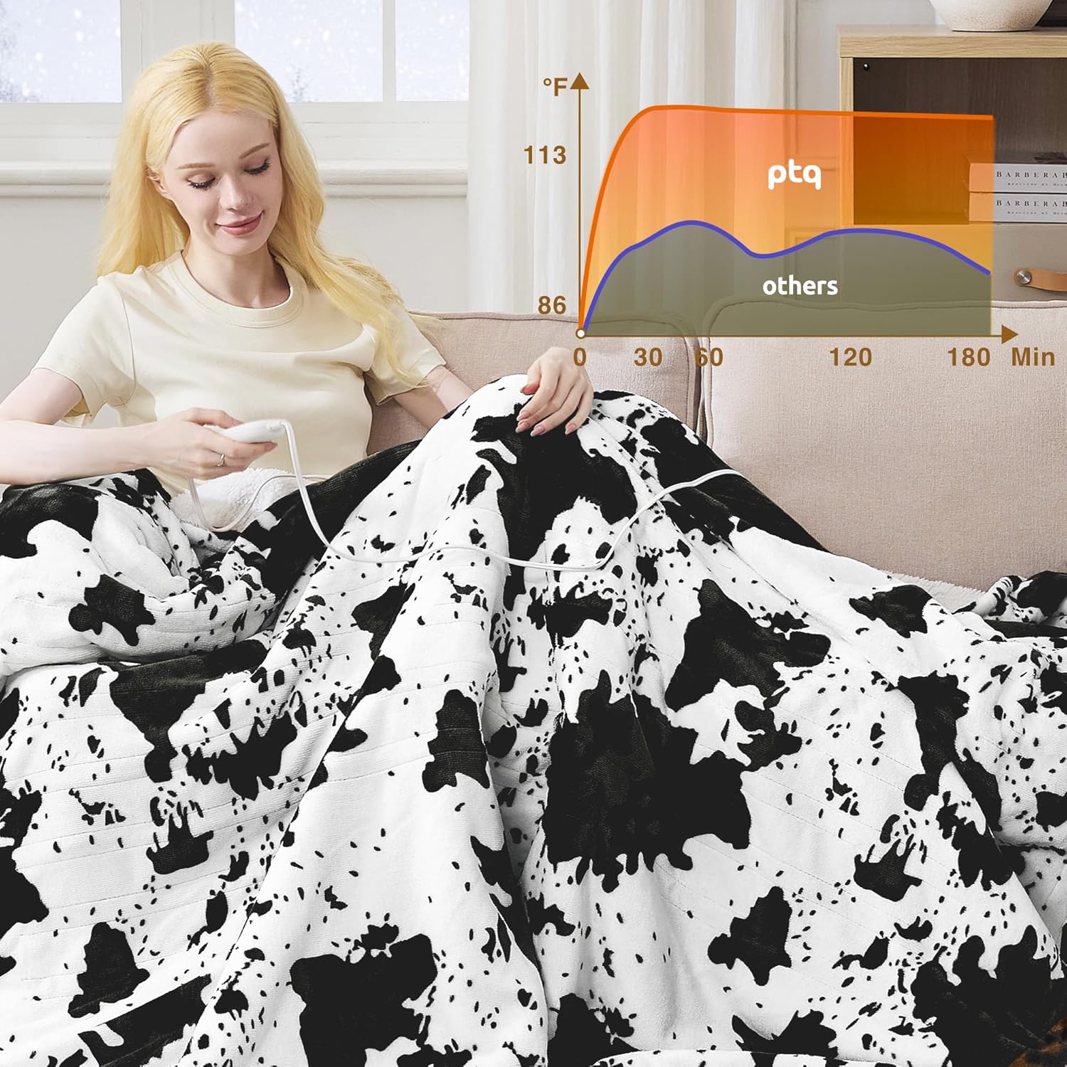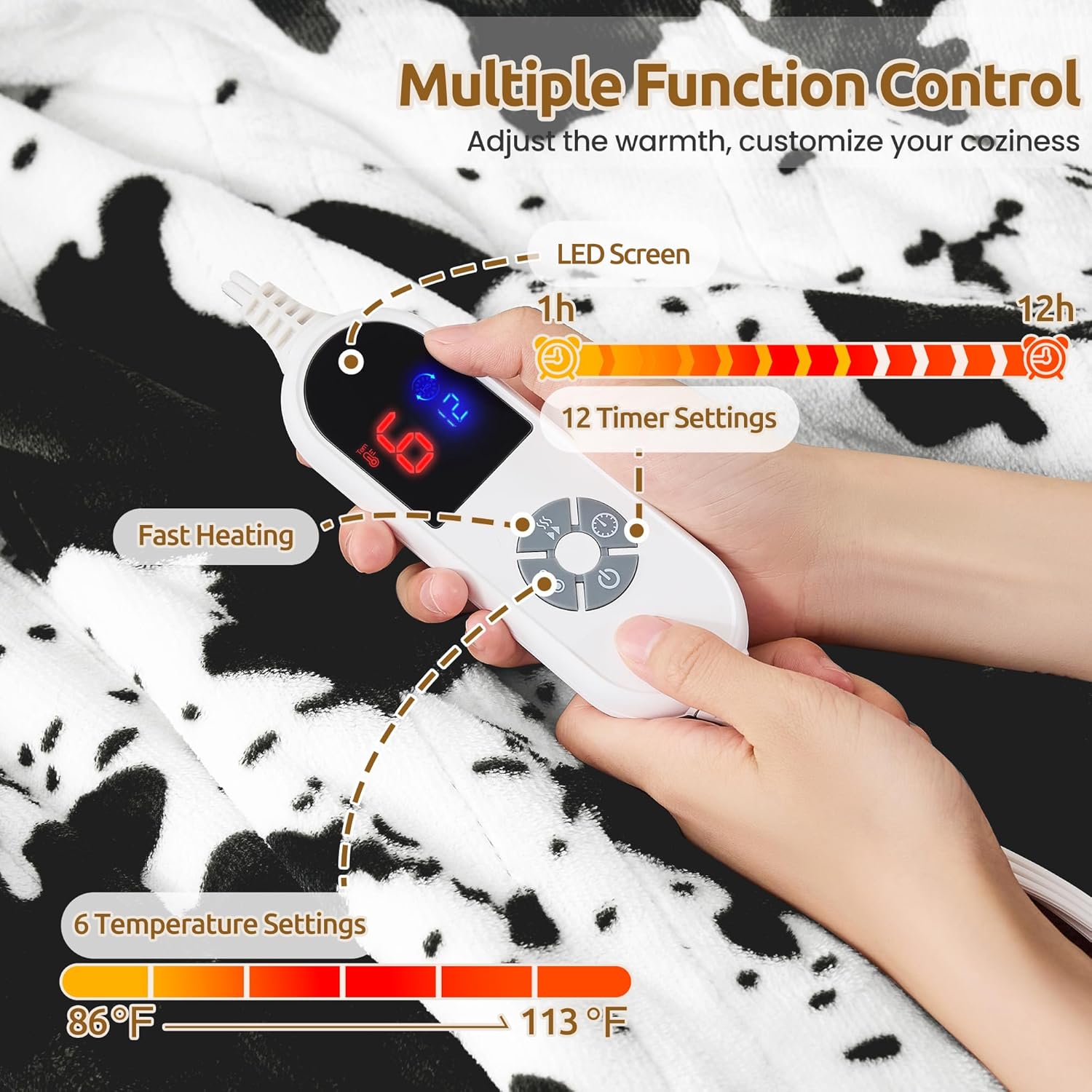Black Cow Print Heated Throw Blanket 50"x60", Electric Blanket with 6 Heat Settings & 1-12H Timer, Cozy Soft Flannel Sherpa, Machine Washable, Warm Gift for Women
