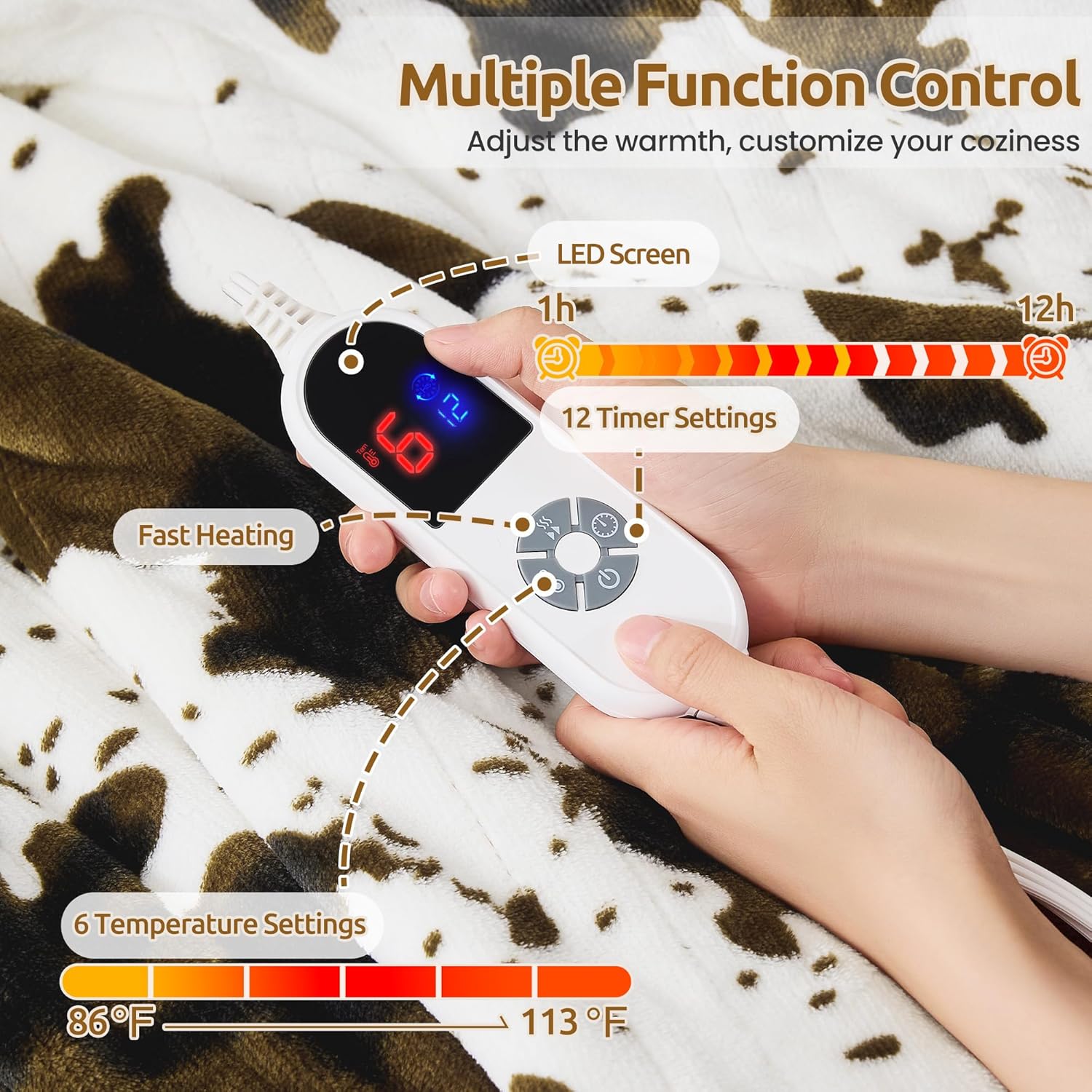 Brown Cow Print Heated Throw Blanket, Electric Blanket with 6 Heat Settings & 1-12H Timer, Cozy Soft Flannel Sherpa, Machine Washable, Warm Gift for Women, 50"x60"