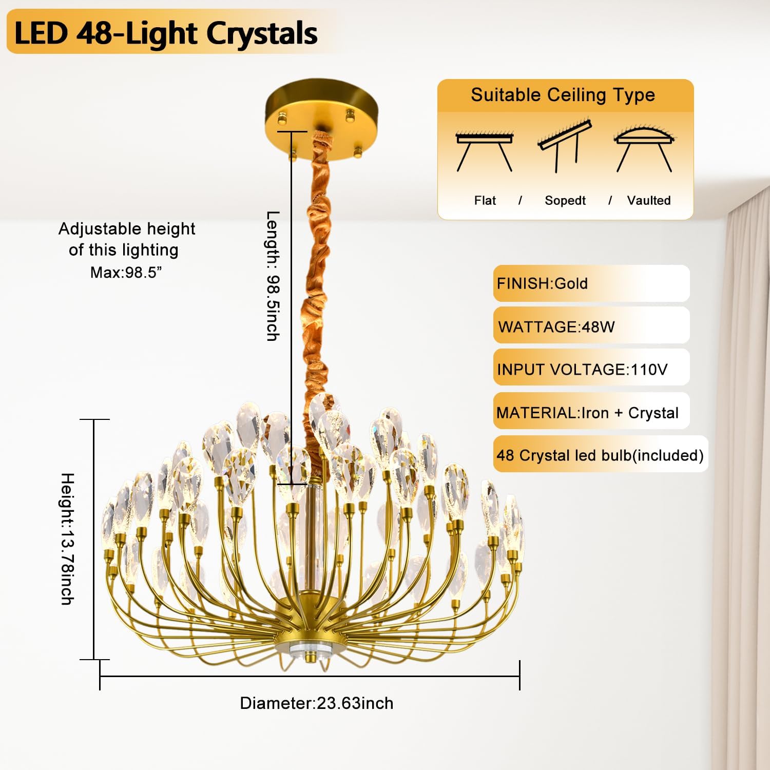 - Chandelier size: D23.63" x H13.78".The compact round design and flush mount installation (adjustable height up to 98.4") make it perfect for rooms with limited ceiling space while still providing elegant lighting with its 48 LED crystals.