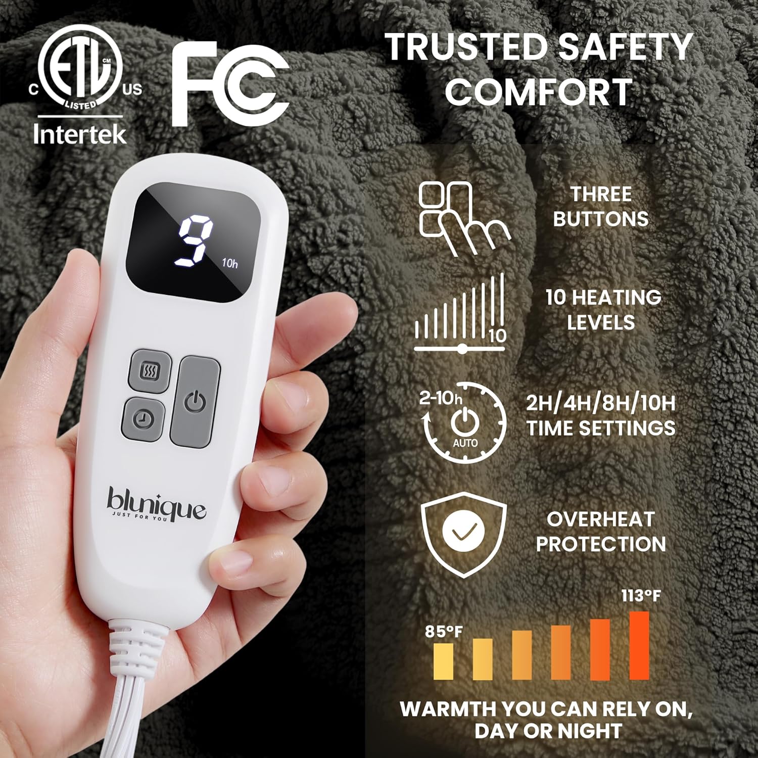 - Fast Heating & 10 Custom Heat Levels: Snuggle into soothing warmth within minutes! With 10 adjustable heat settings (85°F–113°F), you can easily find your ideal temperature for movie nights, reading, or preheating your bed. The upgraded heating system delivers even, consistent warmth across the entire blanket, while the 2–10 hour auto-off timer ensures safe, worry-free use all night long