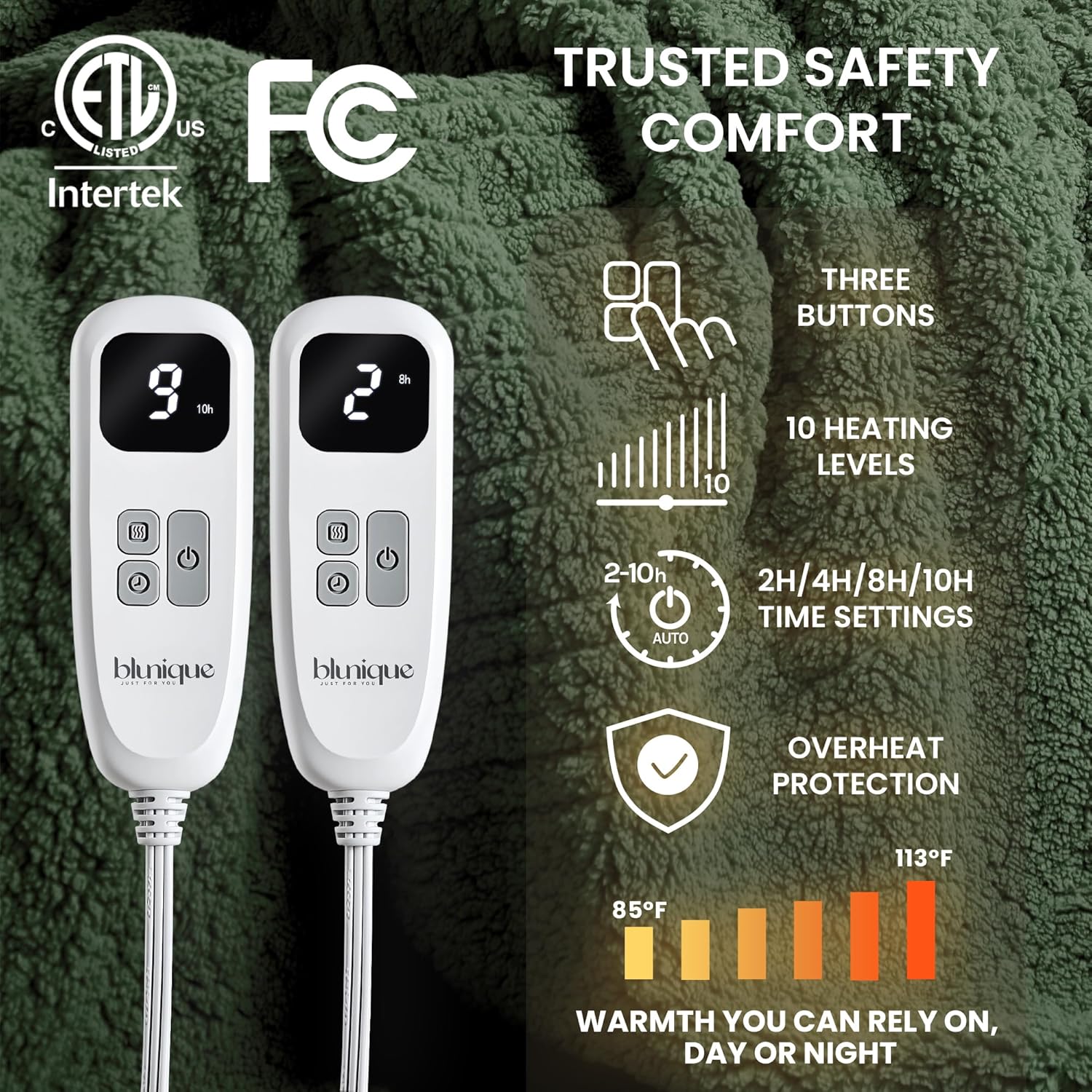 - Fast Heating & 10 Custom Heat Levels: Snuggle into soothing warmth within minutes! With 10 adjustable heat settings (85°F–113°F), you can easily find your ideal temperature for movie nights, reading, or preheating your bed. The upgraded heating system delivers even, consistent warmth across the entire blanket, while the 2–10 hour auto-off timer ensures safe, worry-free use all night long