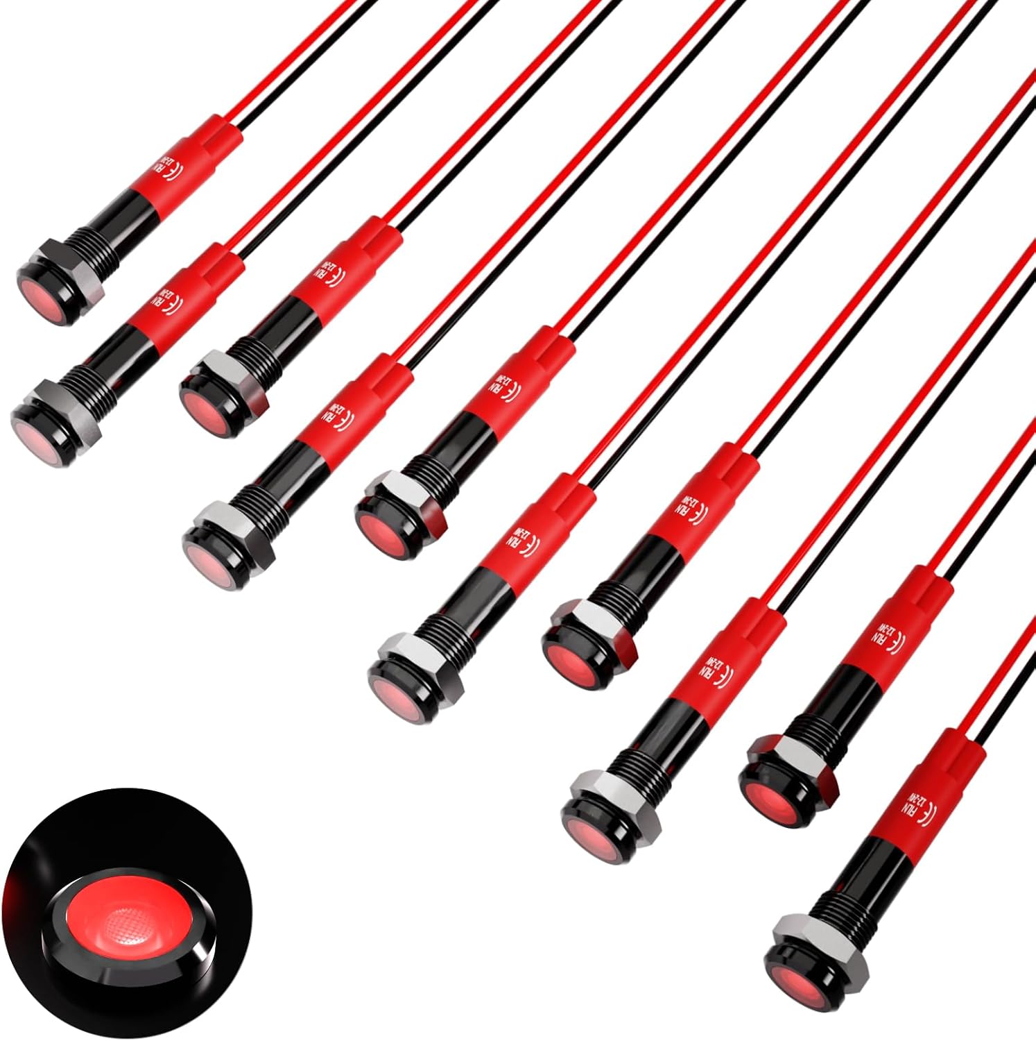 Indicator Light 10pcs 6mm 1/4" AC 12-24V Metal LED Waterproof Signal Lamp Pilot Dash Directional Car Truck Boat with Wire(Red 12V-24V)