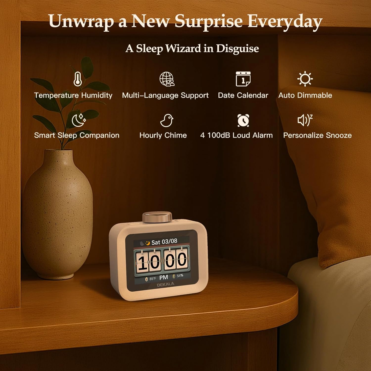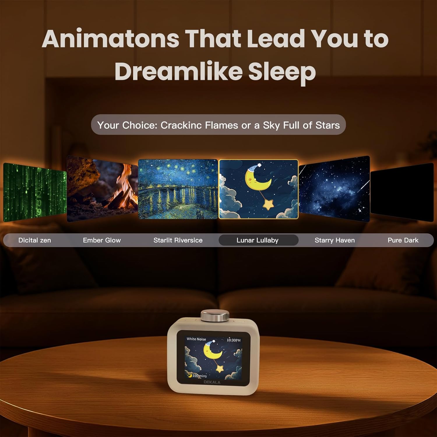 - 【Create Healthy Sleep/Wake ecosystem】 Build a screen-free sleep sanctuary with Dekala’s all-in-one ecosystem – no scrolling, just tap to play 30+ lab-tuned sounds (white/brown/pink noise) synced with dynamic sleep animations (campfire, stars) , adding 5-min to ∞ Timer, Customize playback duration or let it run all night.