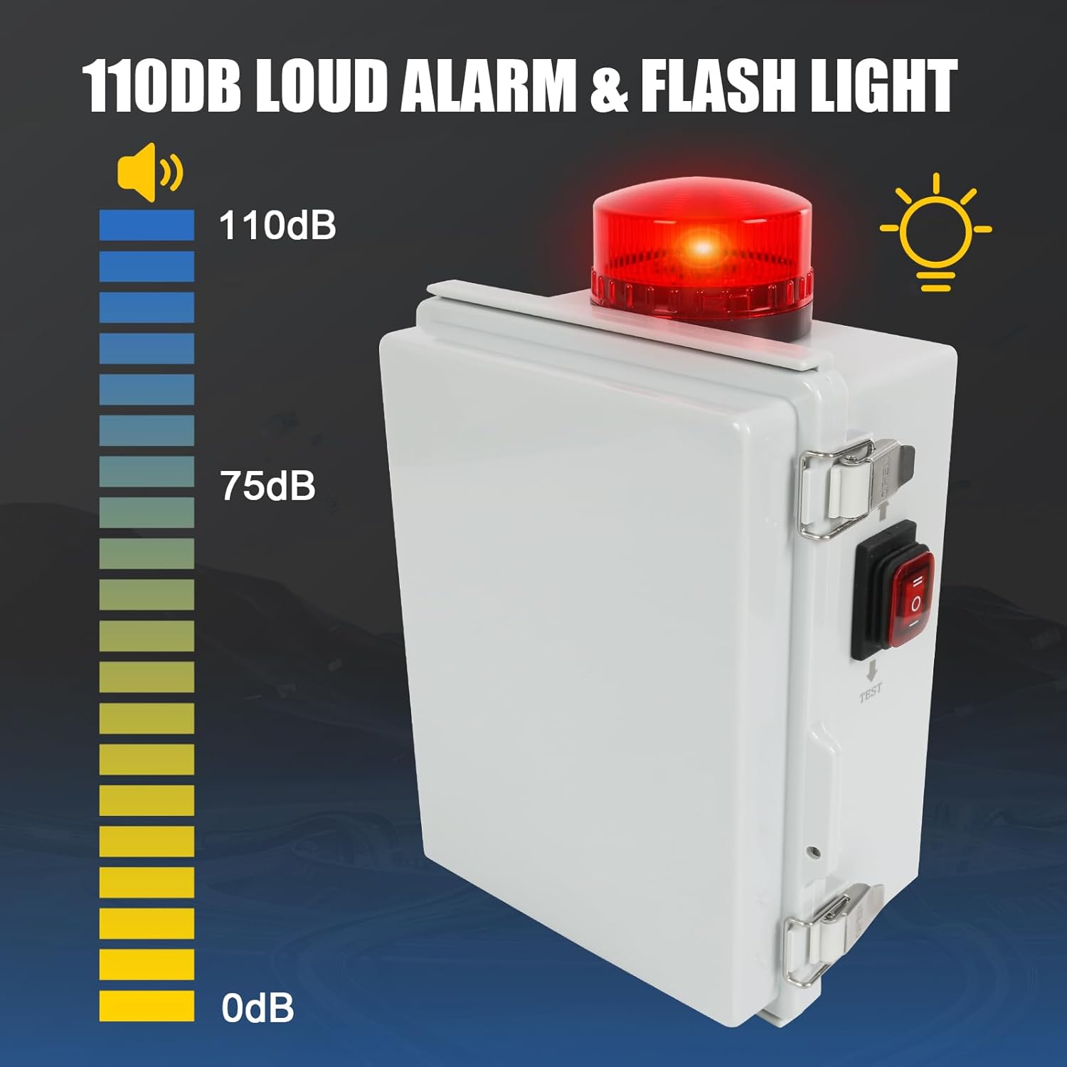 - 110-Decibel Alarm: High water alarm with IP67 waterproof casing, by using a float switch, it can detect the water level. When the water level reaches the predetermined level, the alarm will activate, emitting a 110dB alarm sound and flashing lights