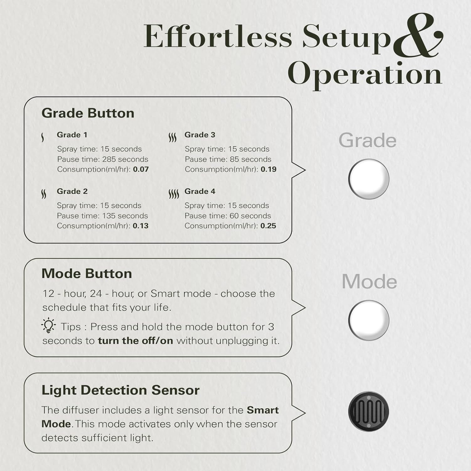 - Special Feature : No water, no heat—just clean, effective diffusion. Plug and play. Automatic shut-off at dark in smart mode. Kid & pet Friendly. Luxury scent experience. No water, no heat—just clean, effective diffusion. Plug and play. Automatic shut-off at dark in smart mode. Kid & pet Friendly. Luxury scent experience.