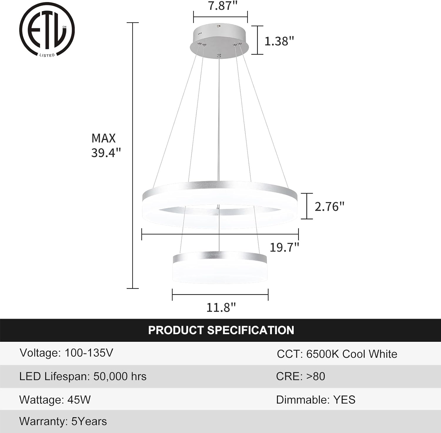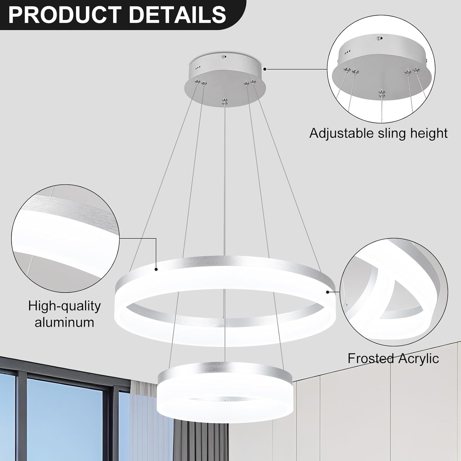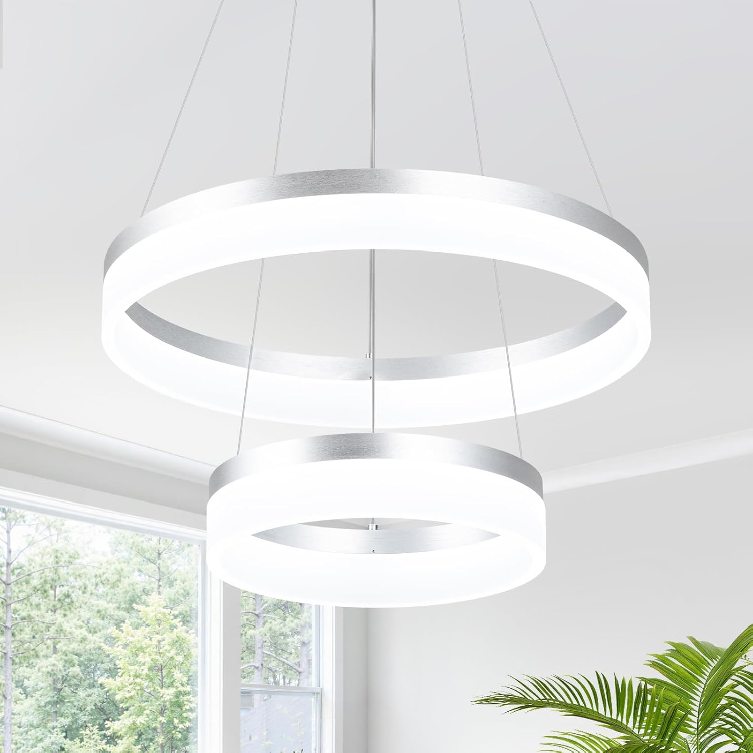 - 【Dimmable & Color-Tunable LED Lighting】This 45W silver 3-ring pendant light is equipped with a high-clear LED strip that delivers 3000K-6500K cool white light—adjust the color temperature to match your mood, from warm 3000K for quiet evenings to bright 6500K for meal prep. It also supports 10%-100% brightness adjustment with any US standard dimmer switch (not included), letting you tweak light intensity for dinners, movie nights, or daily activities