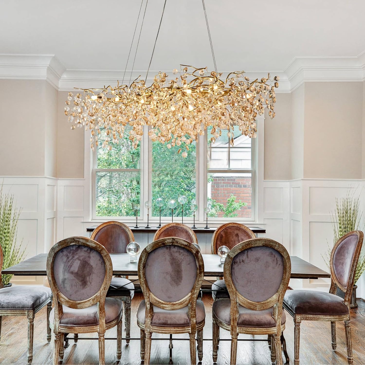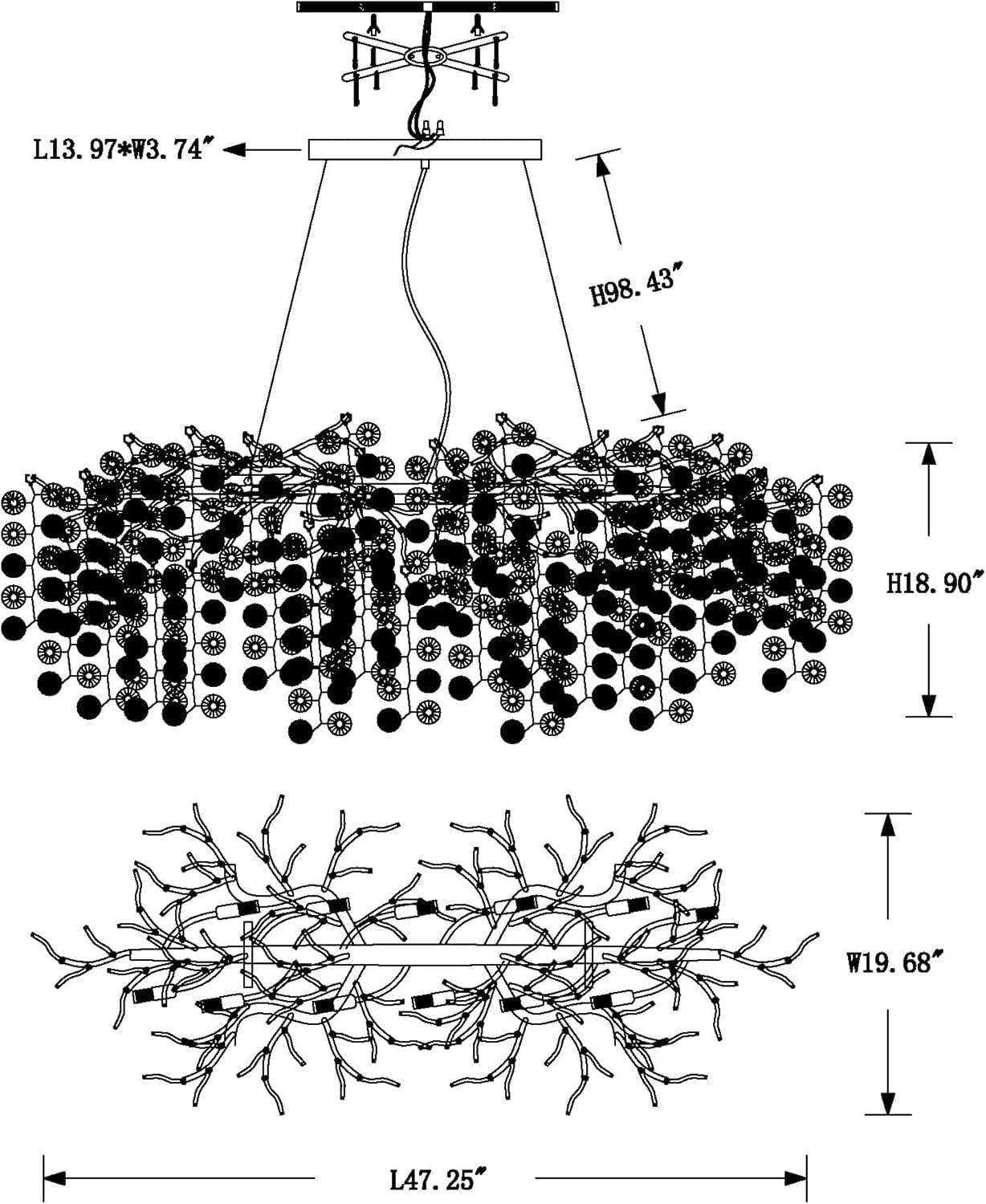 - Designed as a chandelier with handmade metal aluminum branches and clear crystals, The whole lamp presents an artistic beauty under the light, Which will add elegance and luxury to your home